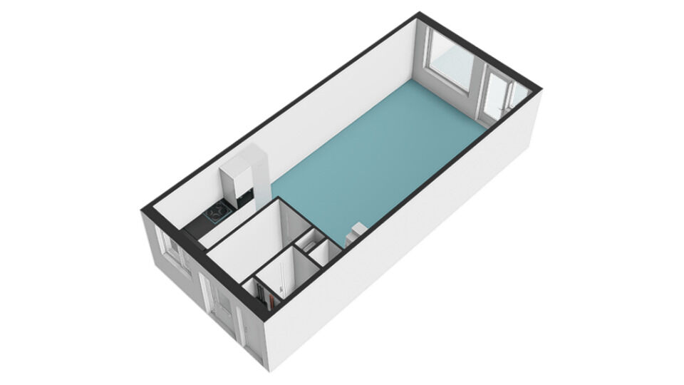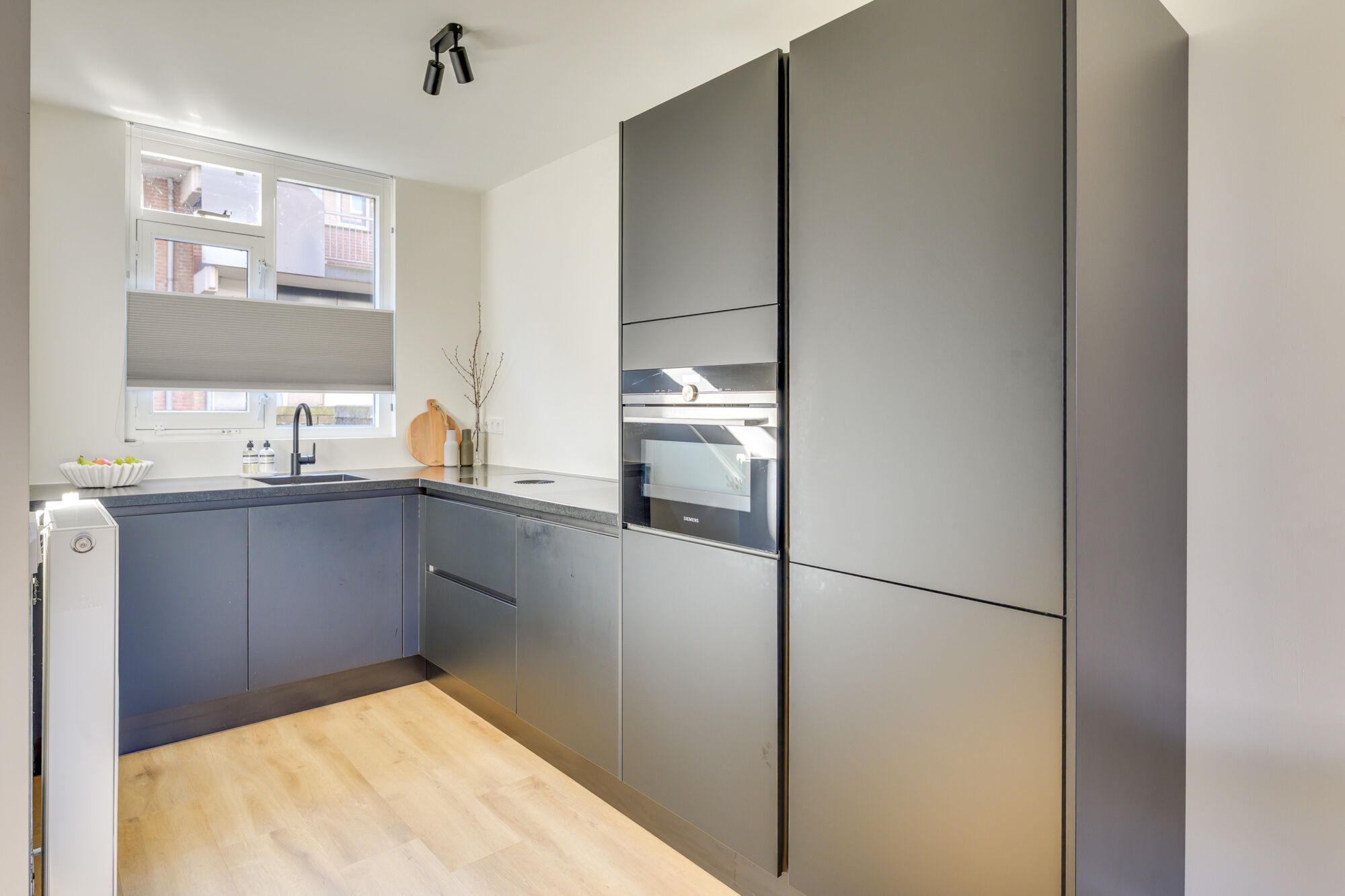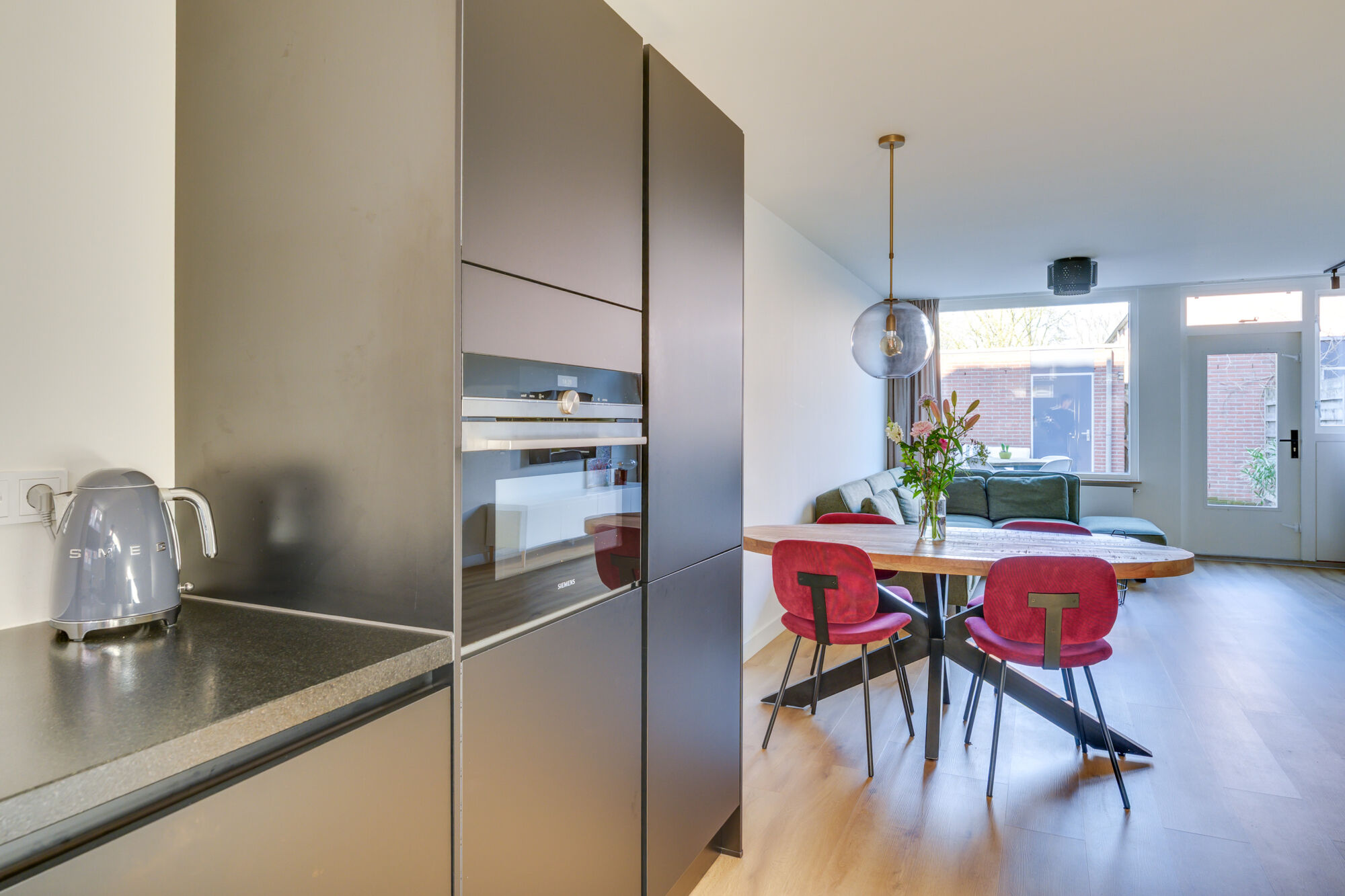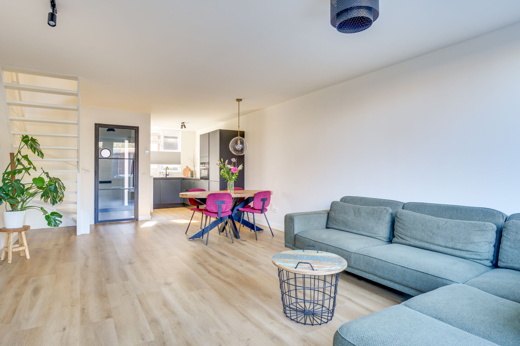 Aan de achterzijde van deze fijne woonkamer bevindt zich de zithoek, een fijne brede opstelling om uw meubilair eenvoudig te kunnen opstellen. Aan de voorzijde van deze woning bevindt zich de open keuken. Tussen de keuken en zithoek heeft u de perfecte ruimte om een gezellige dinertafel te plaatsen!