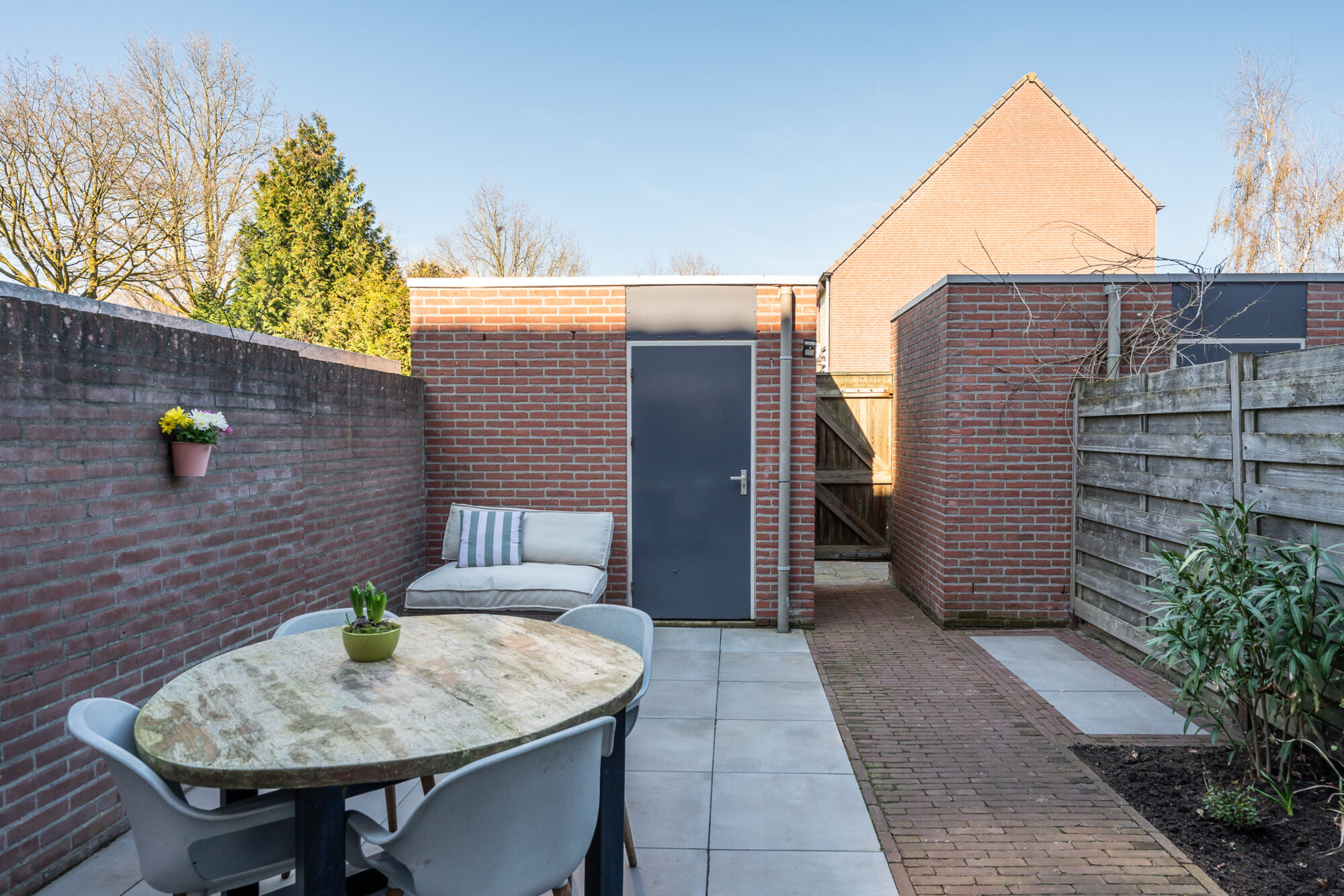 Deze prachtige woning beschikt over een ruime achtertuin, voorzien van een diepte van maar liefst circa 9 meter! Deze achtertuin is onderhoudsvriendelijk, strak gelegd en voorzien van een prachtig terras. Aan de achterzijde bevindt zich de vrijstaande bergingsruimte voorzien van elektriciteit en een nette tegelvloer.