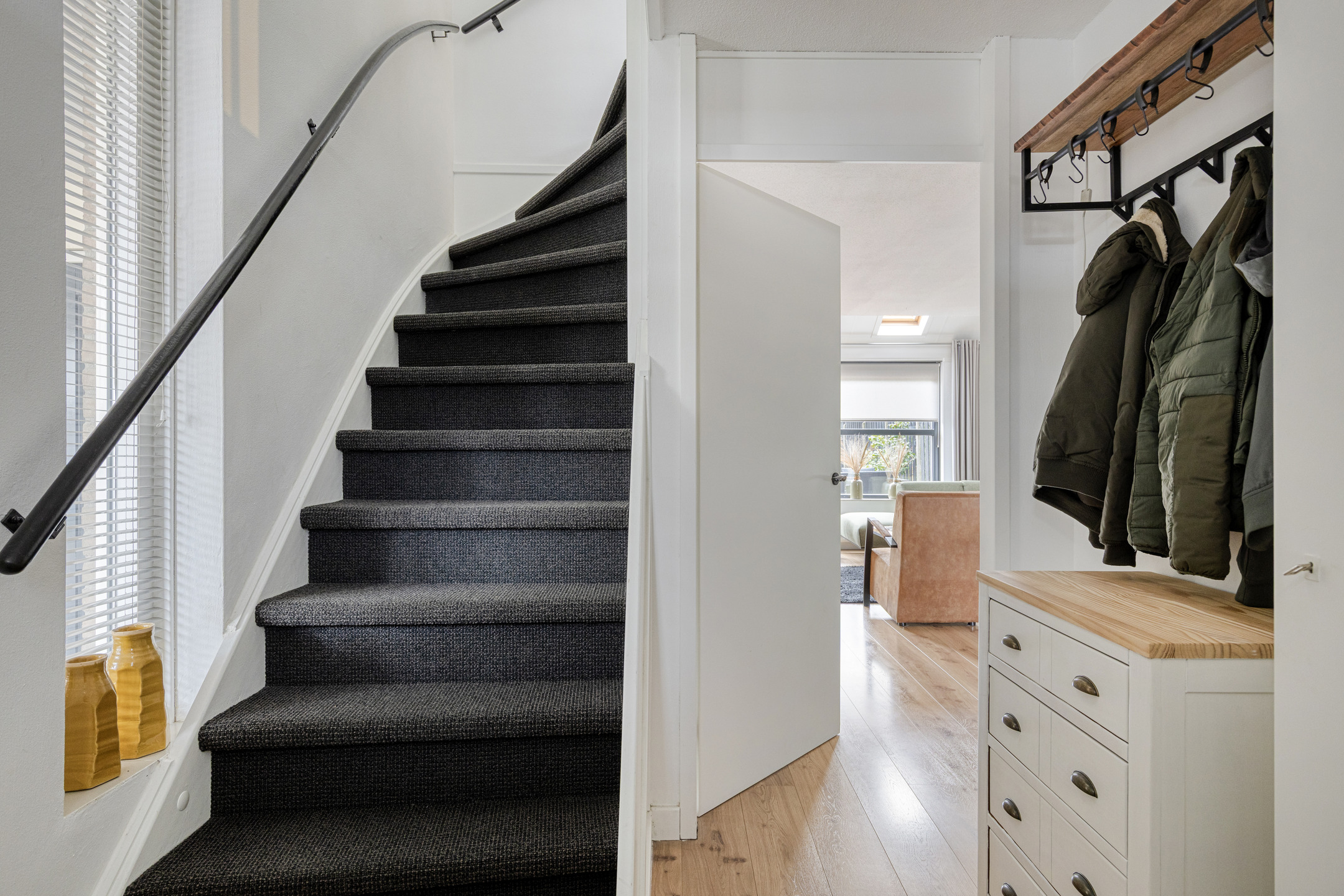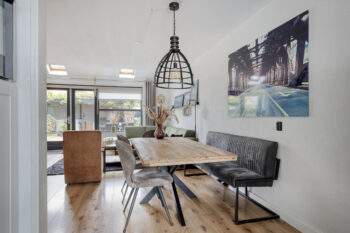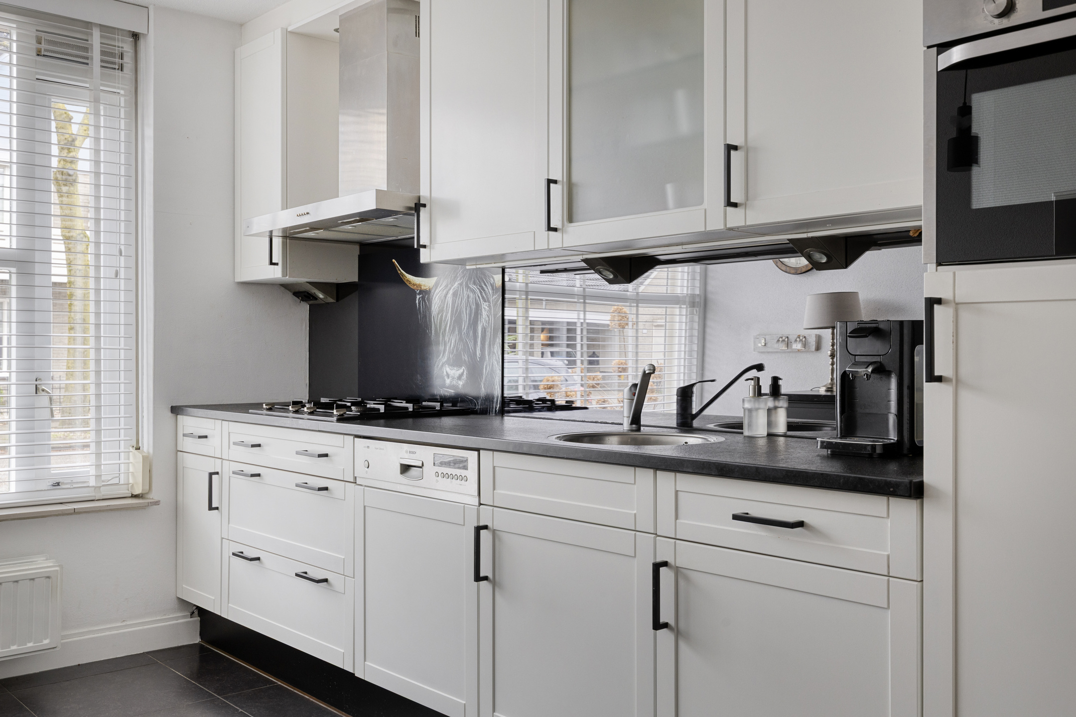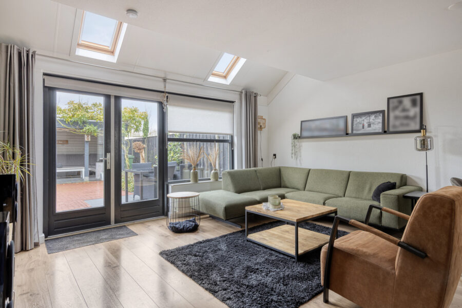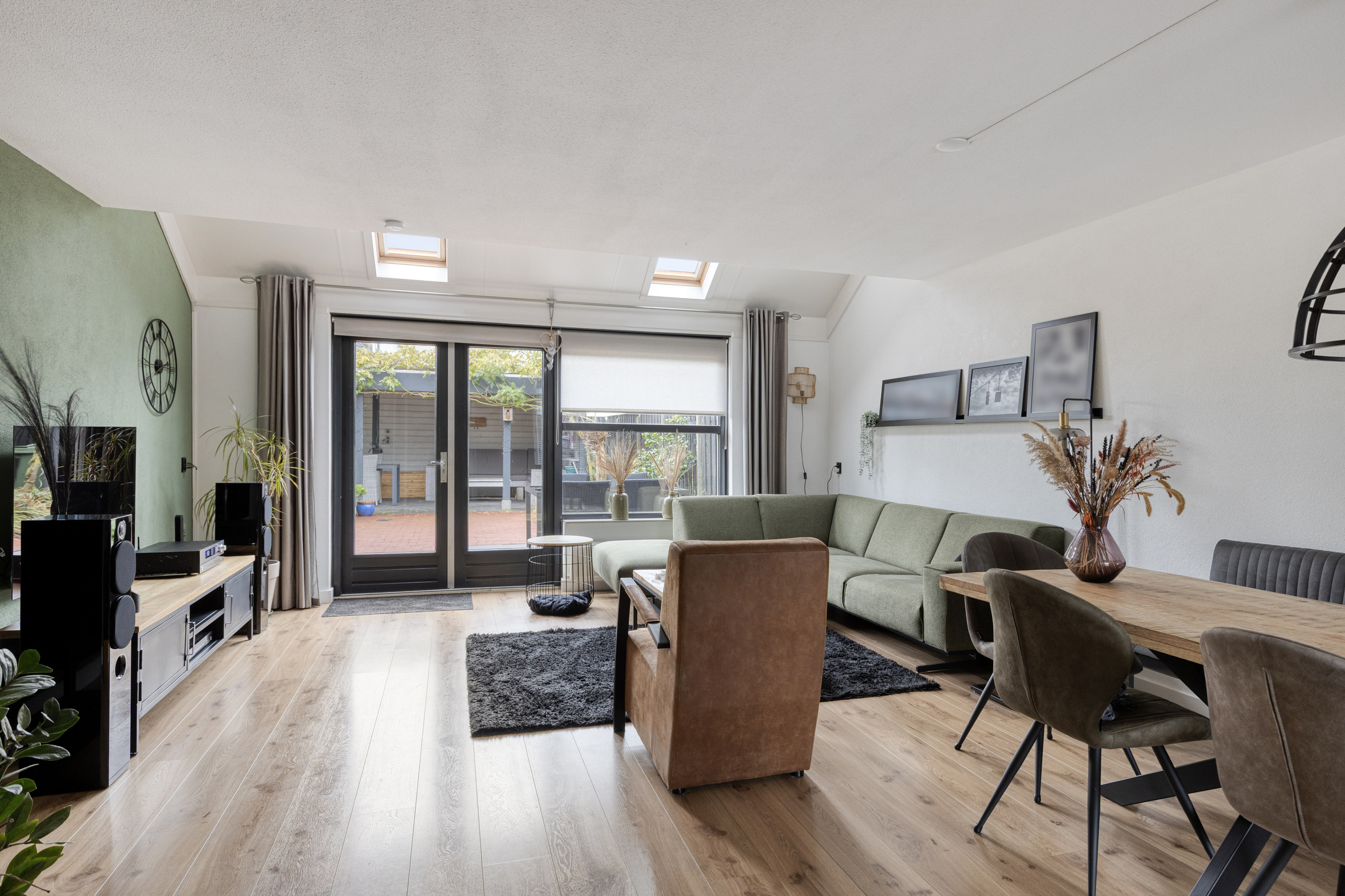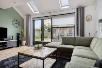 Zo heeft u de gelegenheid om aan de achterzijde een fraaie zithoek te creëren, deze zithoek beschikt over grote tuindeuren en een tweetal dakramen waardoor er bijzonder veel lichtinval aanwezig is in deze fijne woonkamer. Tussen de zitruimte aan de achterzijde van de woning en de open keuken aan de voorzijde heeft u de ruimte een gezellige dinertafel te plaatsen! De bergingsruimte onder de trap verzorgt berging van uw provisie en huishoudelijke apparaten.