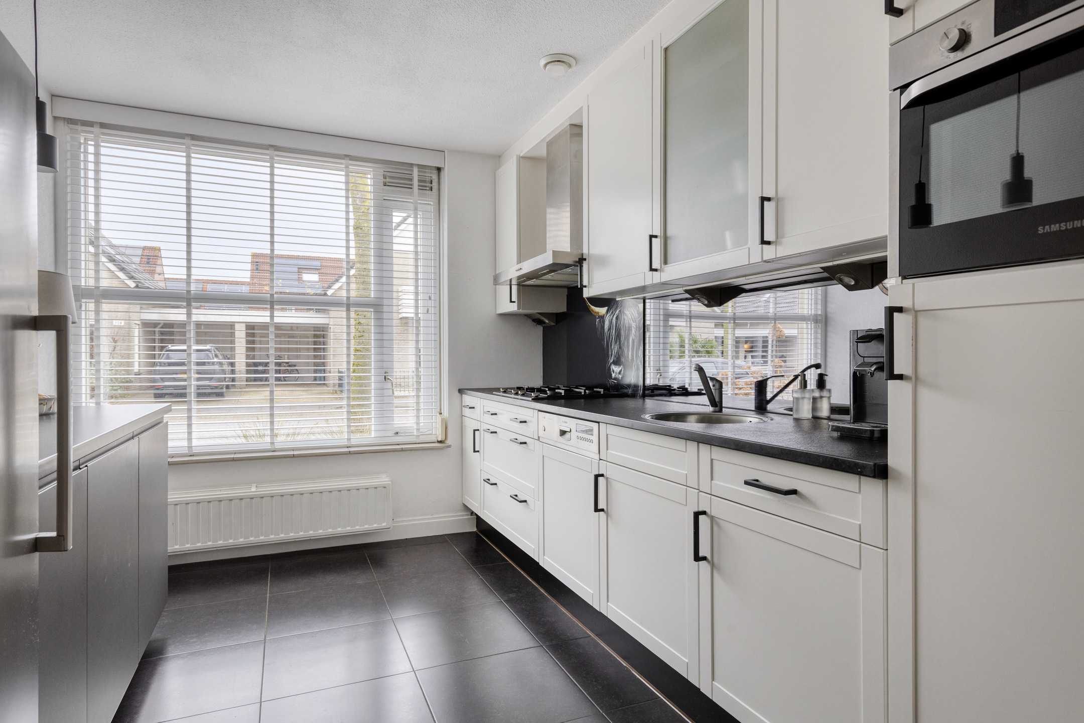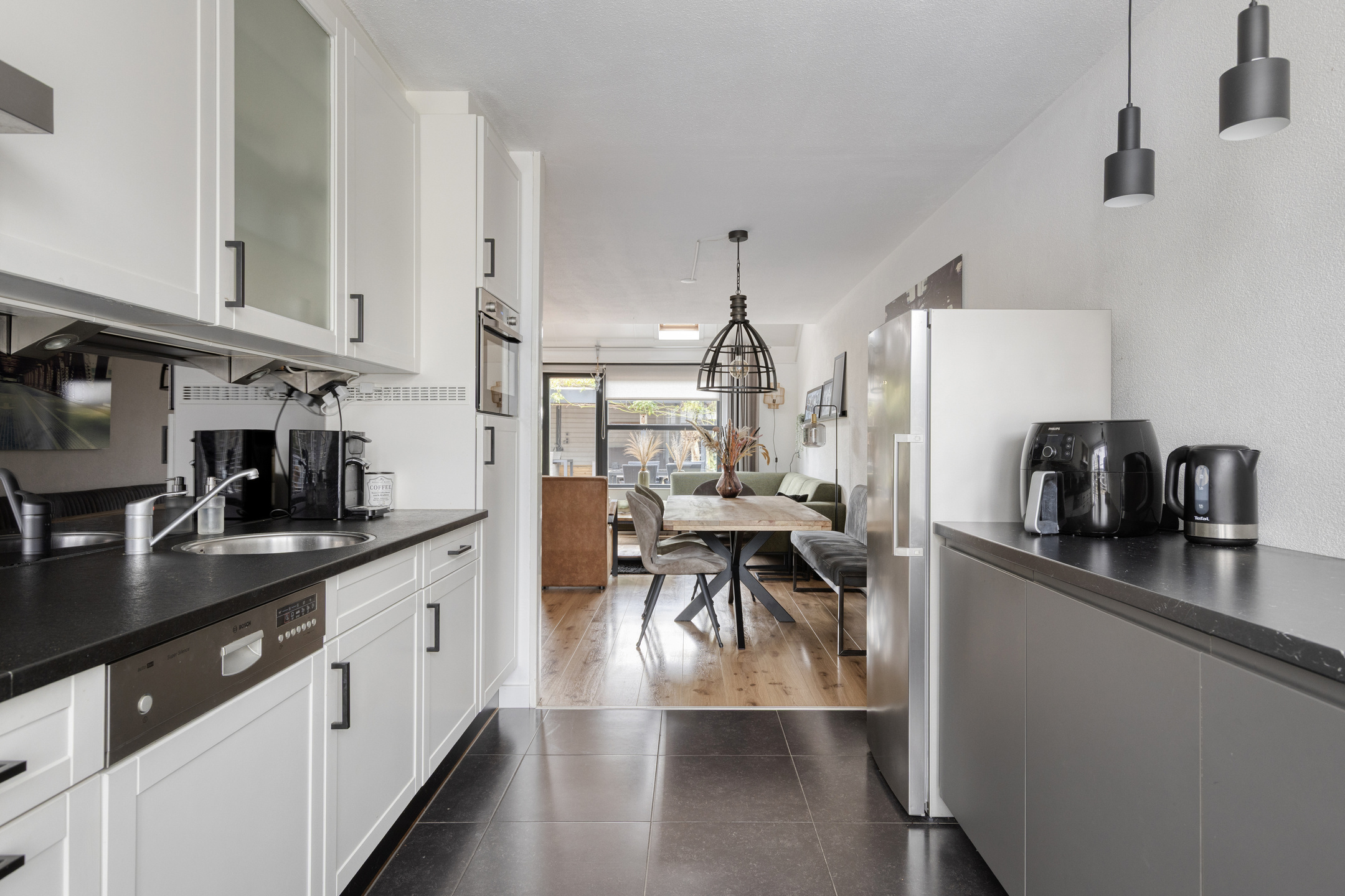 Aan de voorzijde van deze leuke woning en met uitzicht over de woonstraat bevindt zich de open keuken. Deze is in wandopstelling tegenover elkaar geplaatst en voorzien van veel berg- en werkruimte. Aan inbouwapparatuur treffen we: