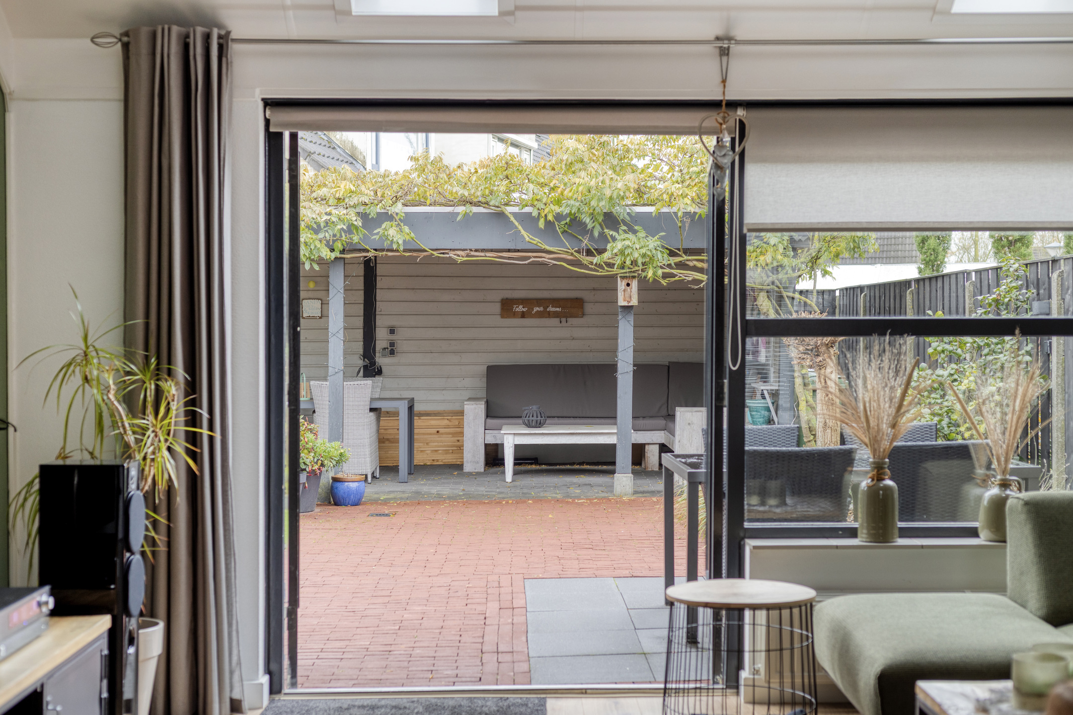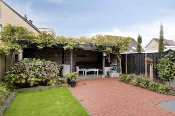 De achtergevel is voorzien van een grote luifel om hier een gezellige dinertafel te kunnen plaatsen! Het gazon van kunstgras is onderhoudsvriendelijk doch groen en biedt een sfeervol beeld. Aan de achterzijde van deze ideale achtertuin is een grote terrasoverkapping gerealiseerd, voorzien van veel ruimte en de mogelijkheid tot laat in het jaar van het buitenleven te genieten!