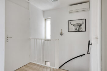 Via de trapopgang in de entree bereiken we de overloop van de eerste verdieping. Deze overloop is voorzien van een airconditioningssysteem en biedt toegang tot de drie slaapkamers, de badkamer en de zolder via een vlizotrap.