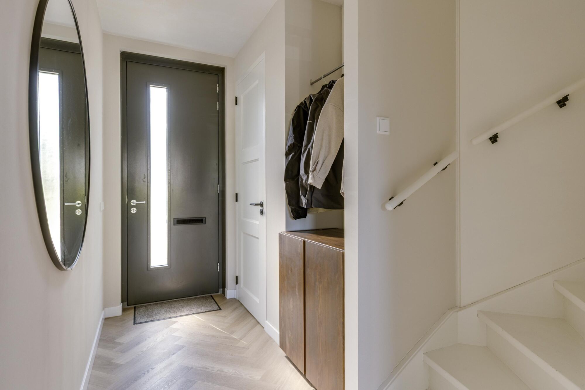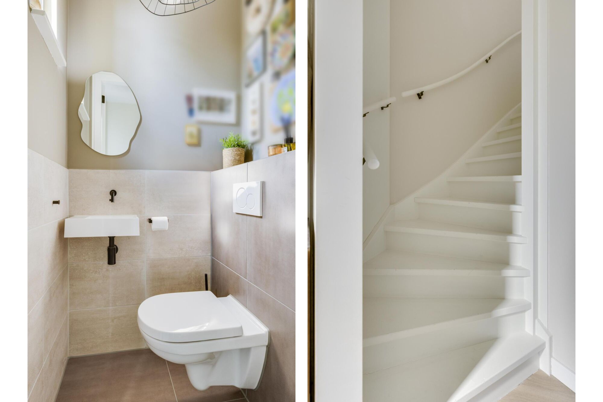 Je betreedt de woning via een uitnodigende hal, compleet met een moderne toiletruimte, meterkast, en trapopgang. De toiletruimte is voorzien van een wandcloset en een fonteintje met matzwart kraan- en leidingwerk. De wand is voorzien van zowel stucwerk als wandtegels. De gehele ruimte is – compleet in stijl met de rest van de woning – uitgevoerd in warme, aardse tinten. Vanuit de entree bereiken we de woonkamer.