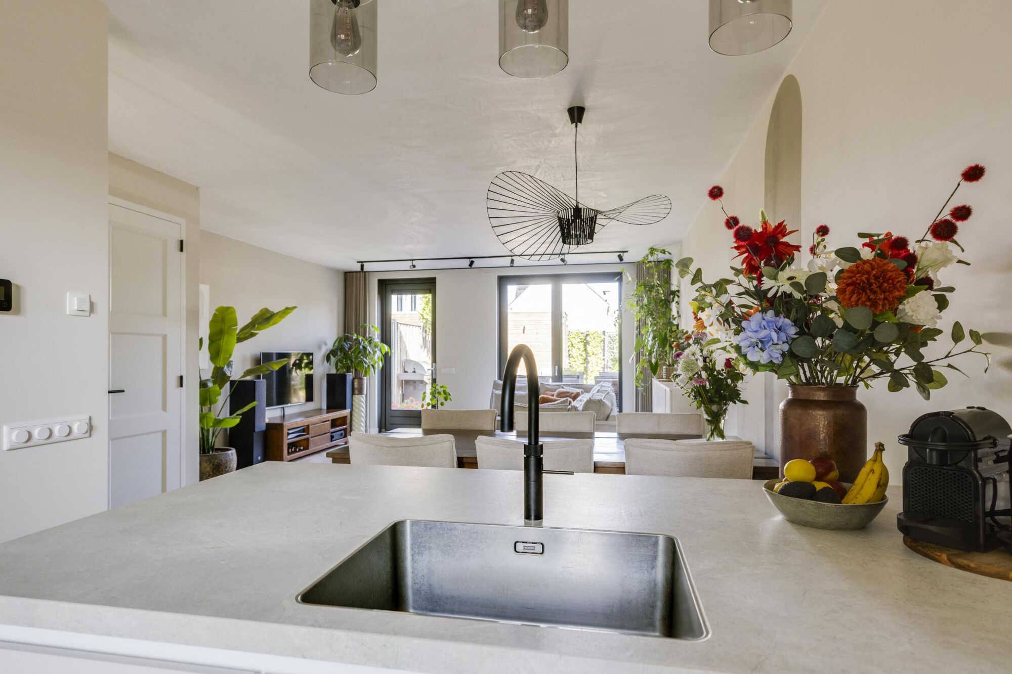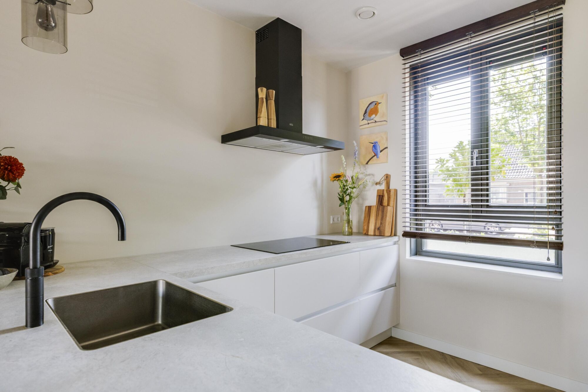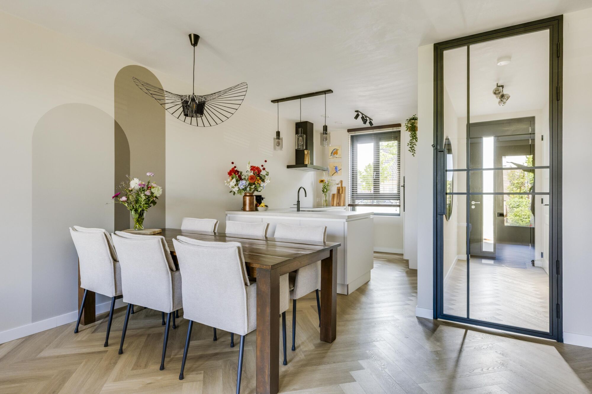 Aansluitend bereik je via een stijlvolle en moderne zwarte stalen deur de prachtige, uitgebouwde woonkamer met open keuken. Deze ruimte biedt geweldig natuurlijk daglichtinval dankzij de tuindeur met daarnaast het plafond hoge raam en beschikt daarbij over een hoogwaardige, PVC vloer in visgraatmotief voorzien van vloerverwarming. Deze vloer is over de gehele begane grond doorgelegd. In de woonkamer bevindt zich ook een praktische trapkast. Omdat de woning aan de achterzijde is uitgebouwd beschikt de ruimte over talloze indelingsmogelijkheden. Hierdoor passen een grote bank en een ruime eettafel eenvoudig in dezelfde fijne ruimte.