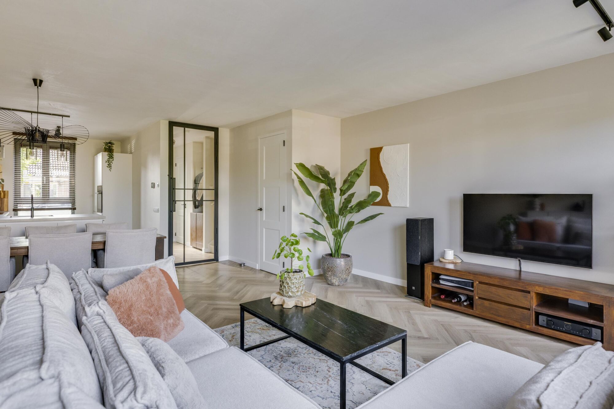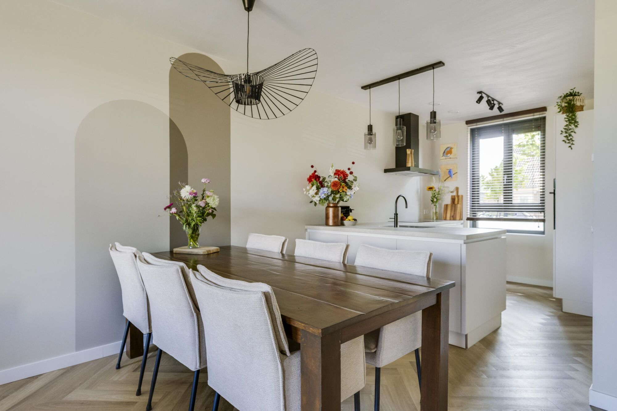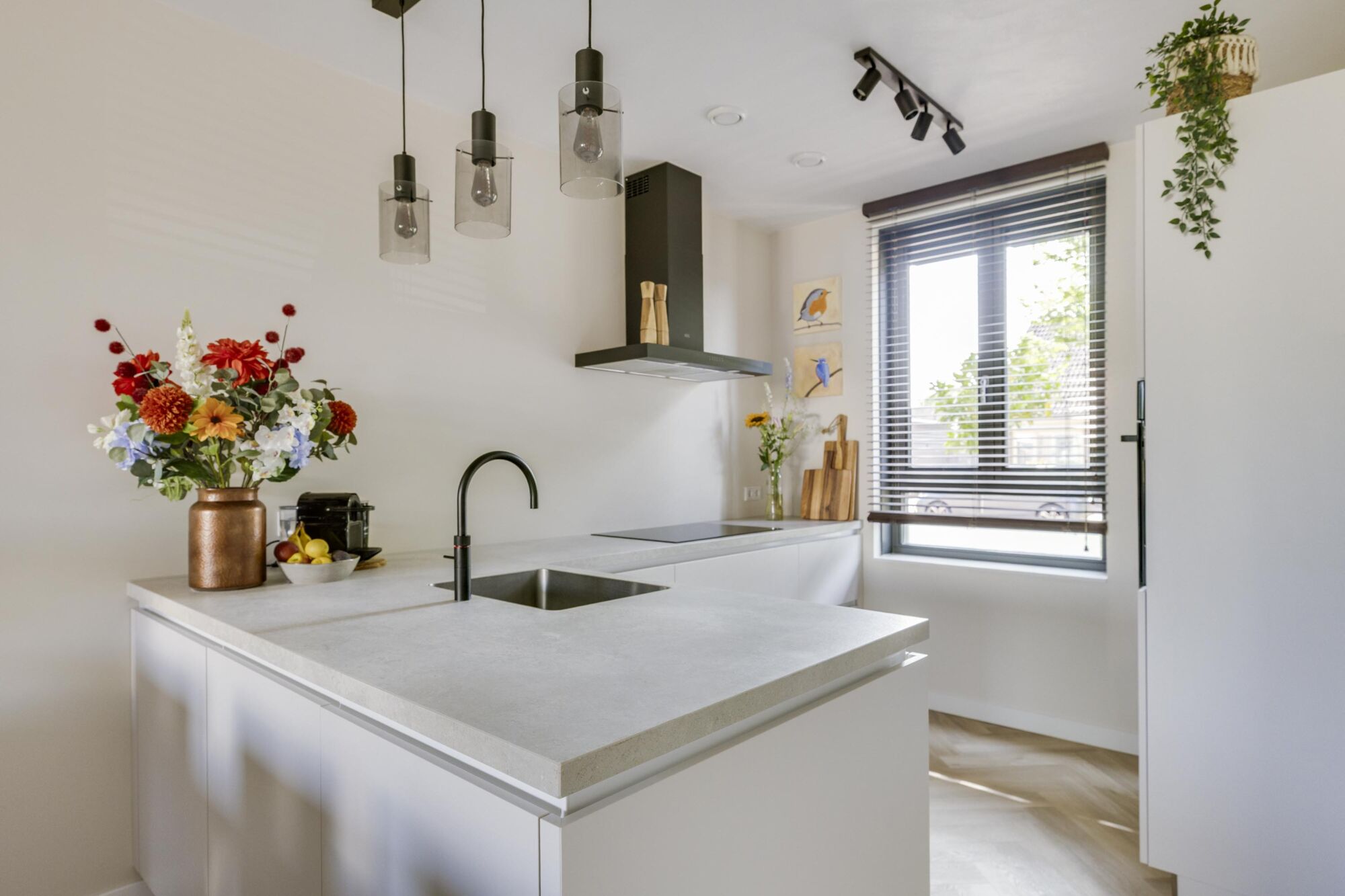 Aansluitend bereik je via een stijlvolle en moderne zwarte stalen deur de prachtige, uitgebouwde woonkamer met open keuken. Deze ruimte biedt geweldig natuurlijk daglichtinval dankzij de tuindeur met daarnaast het plafond hoge raam en beschikt daarbij over een hoogwaardige, PVC vloer in visgraatmotief voorzien van vloerverwarming. Deze vloer is over de gehele begane grond doorgelegd. In de woonkamer bevindt zich ook een praktische trapkast. Omdat de woning aan de achterzijde is uitgebouwd beschikt de ruimte over talloze indelingsmogelijkheden. Hierdoor passen een grote bank en een ruime eettafel eenvoudig in dezelfde fijne ruimte.