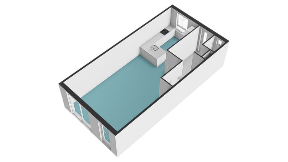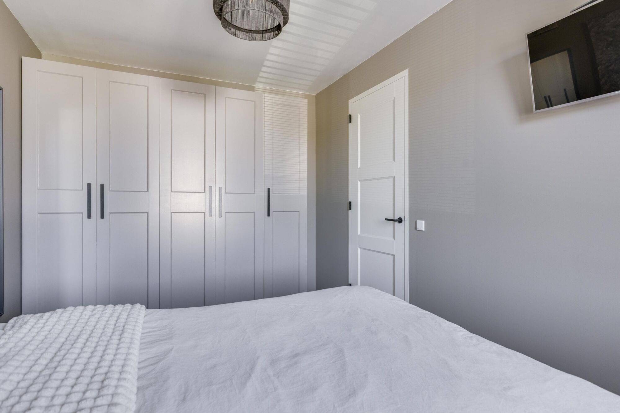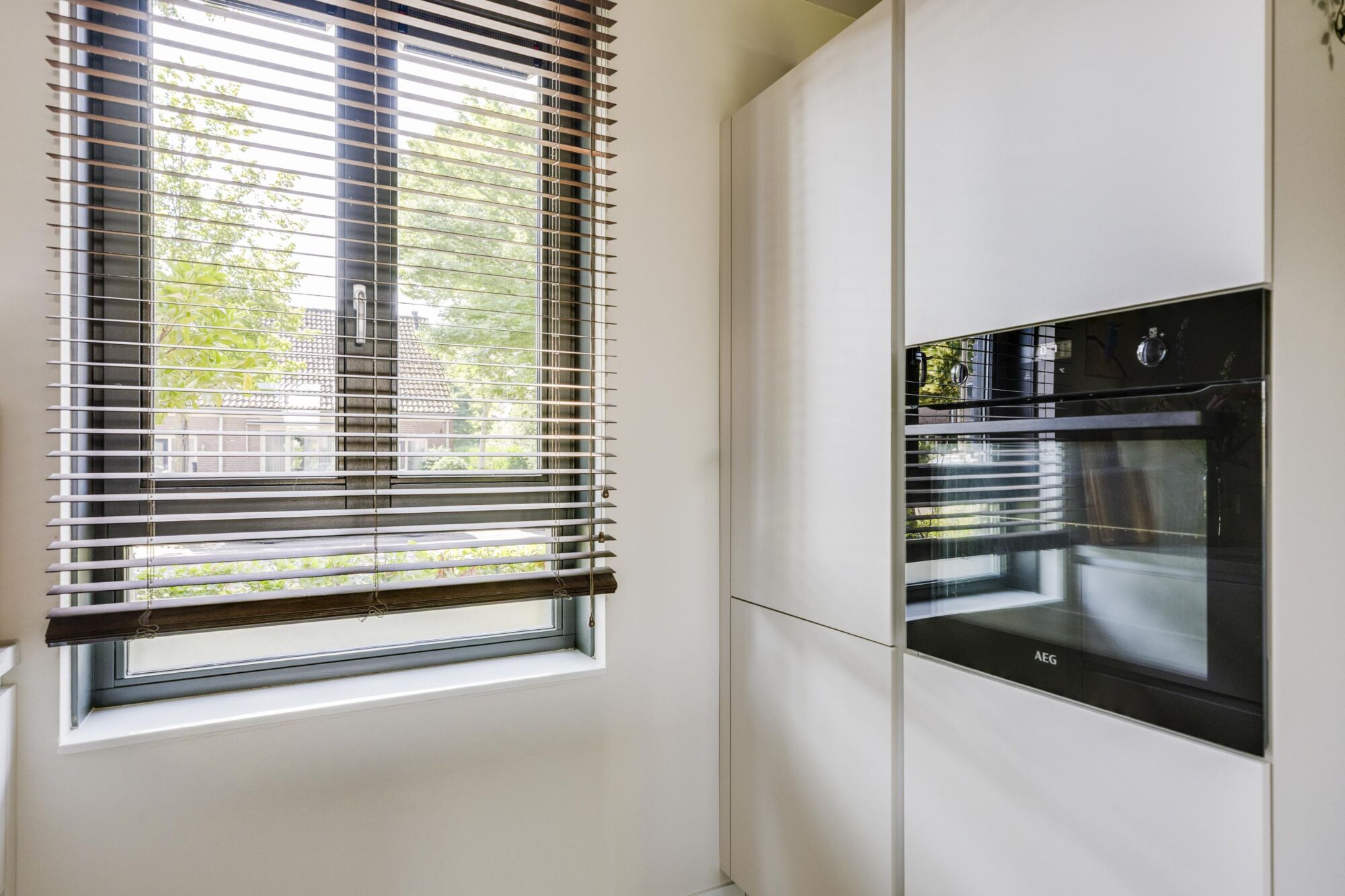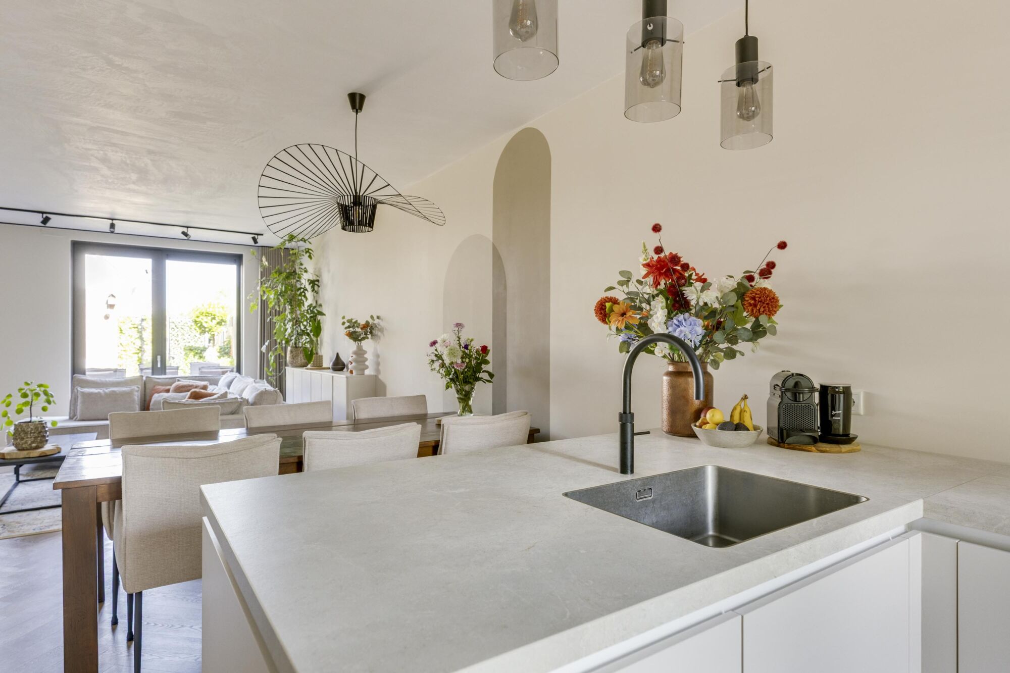 De open keuken aan de voorzijde van de woning is perfect uitgevoerd! Geplaatst in L-vorm voorziet het werkblad meer dan genoeg werkruimte. Tegenover bevindt zich een kastenwand met inbouwapparatuur. De uitvoering van het werkblad in de vorm van een bar zorgt ervoor dat de woonkamer en keuken één geheel worden, derhalve spreken we met recht over een open keuken.