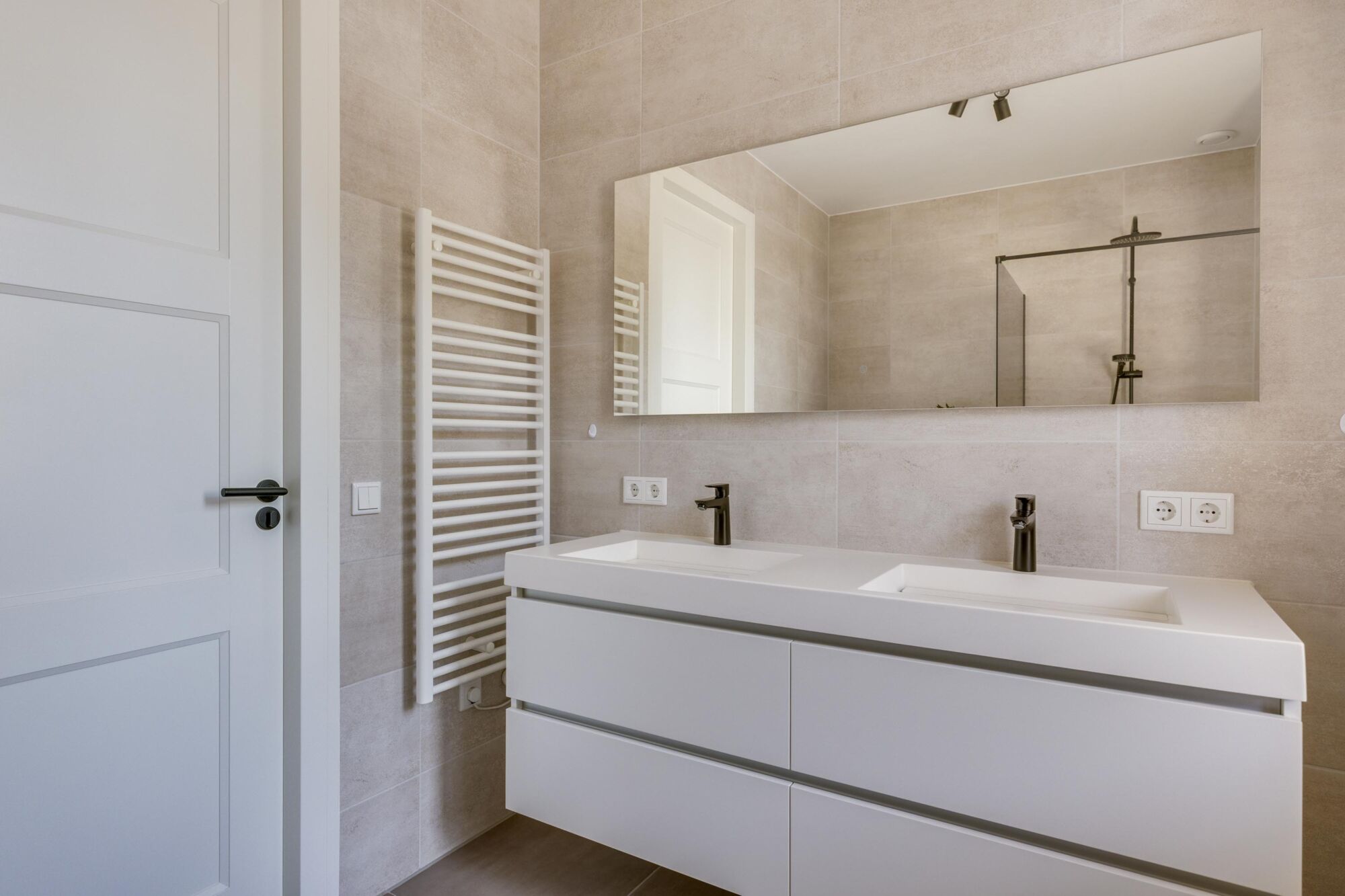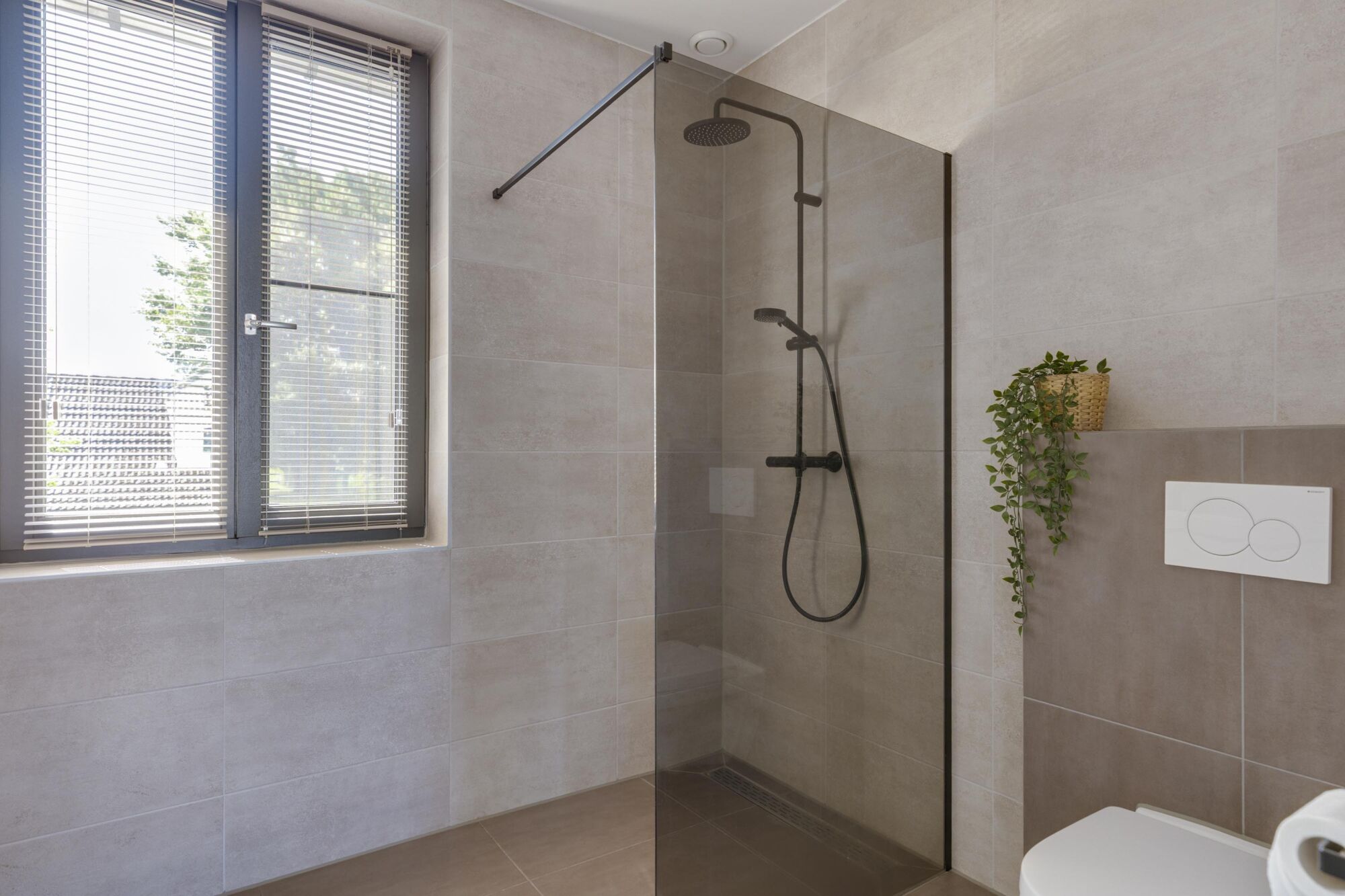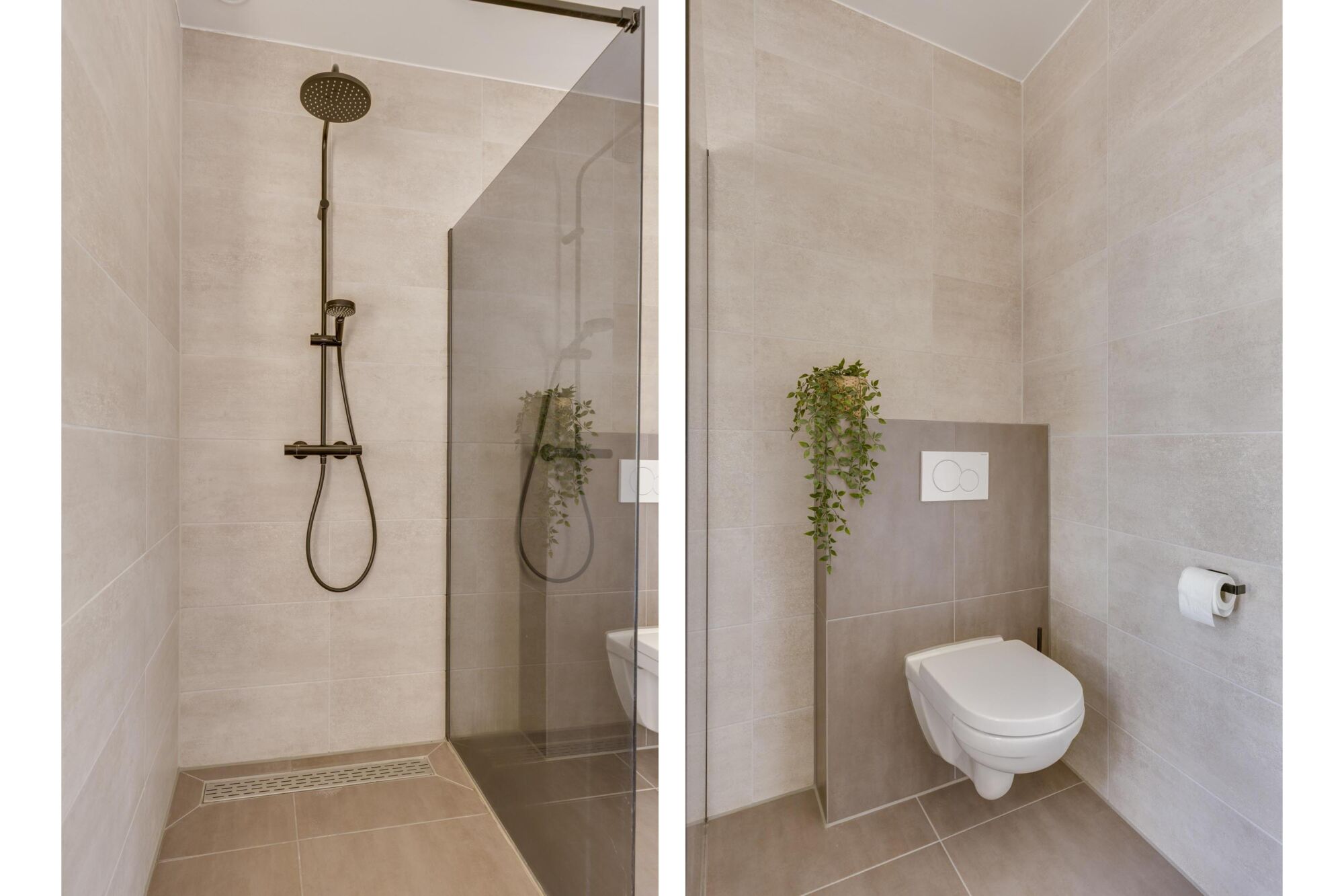Deze prachtige badkamer past perfect bij de stijl van de rest van de woning. Met grote wand- en vloertegels die uitgevoerd zijn in warme kleurtinten en afwerking is het een prachtig samenhangend geheel. De badkamer is voorzien van een wastafelmeubel met twee kranen en vier praktische lades, een zeer ruime inloopdouche met glazen douchewand, een tweede toilet en een handdoekradiator.