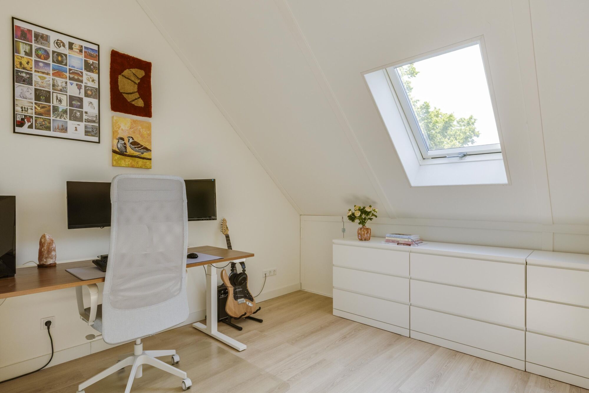 Achter de scheidingswand op de tweede verdieping ligt de vierde slaapkamer welke momenteel als kantoorruimte gebruikt wordt. Net als de voorzolder is deze kamer voorzien van knieschotbergingen voor extra opslag. Dit is de ideale plek voor de thuiswerker maar kan natuurlijk ook als vierde slaapkamer gebruikt worden.