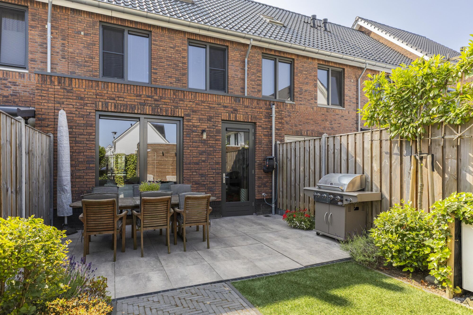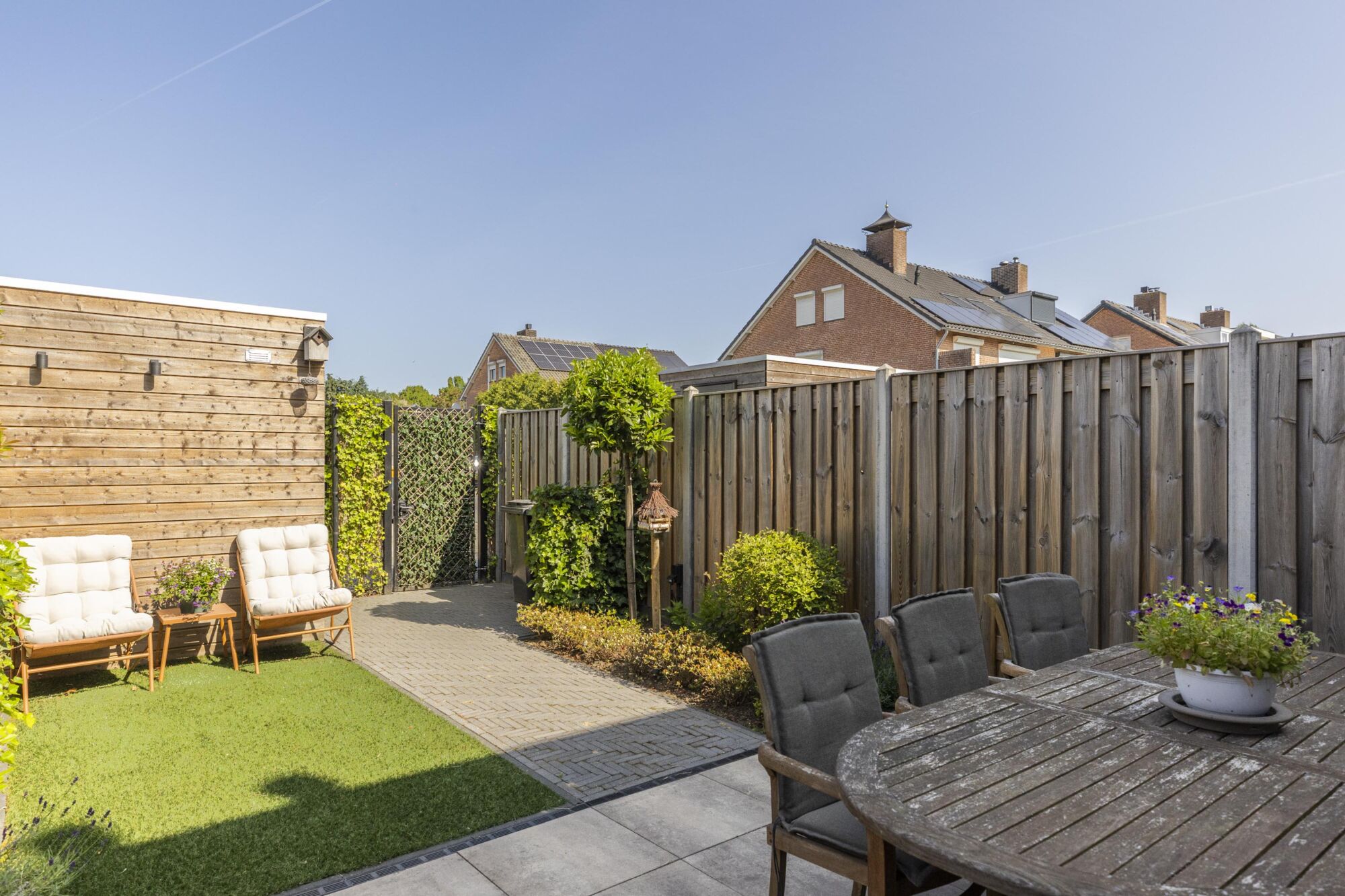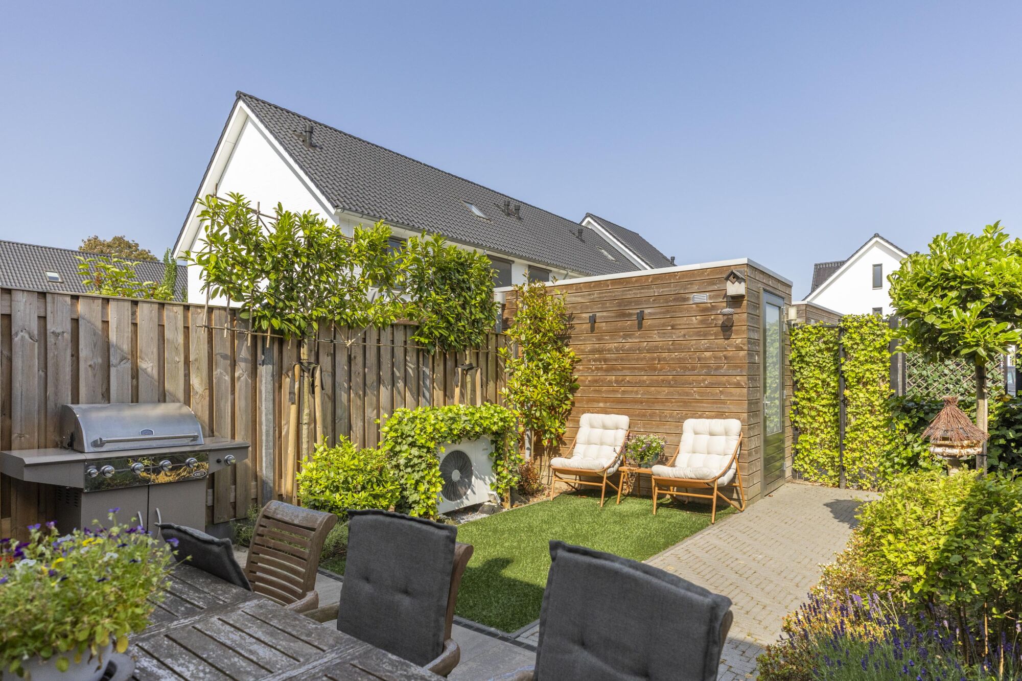 Vanuit de woonkamer loop je via de tuindeur naar de privacy biedende en fijne achtertuin. De achtertuin beschikt over een betegeld terras, een houten berging met elektra aansluitingen en stijlvolle beplanting. In deze tuin geniet u optimaal van de middag- en avondzon vanwege de gunstige en zonnige oriëntatie. Dit, tezamen met de samenstelling van de tuin én de rest van woning creëert een prachtig, sfeervol geheel.