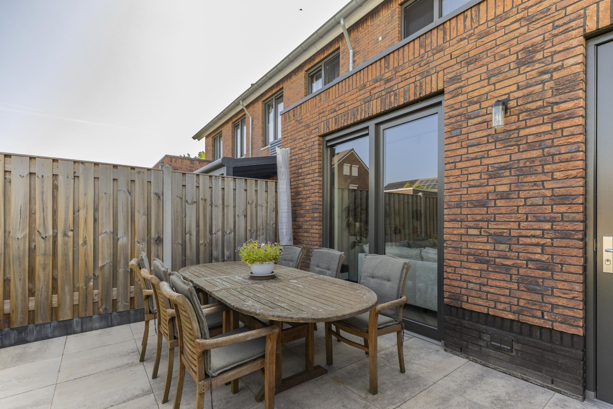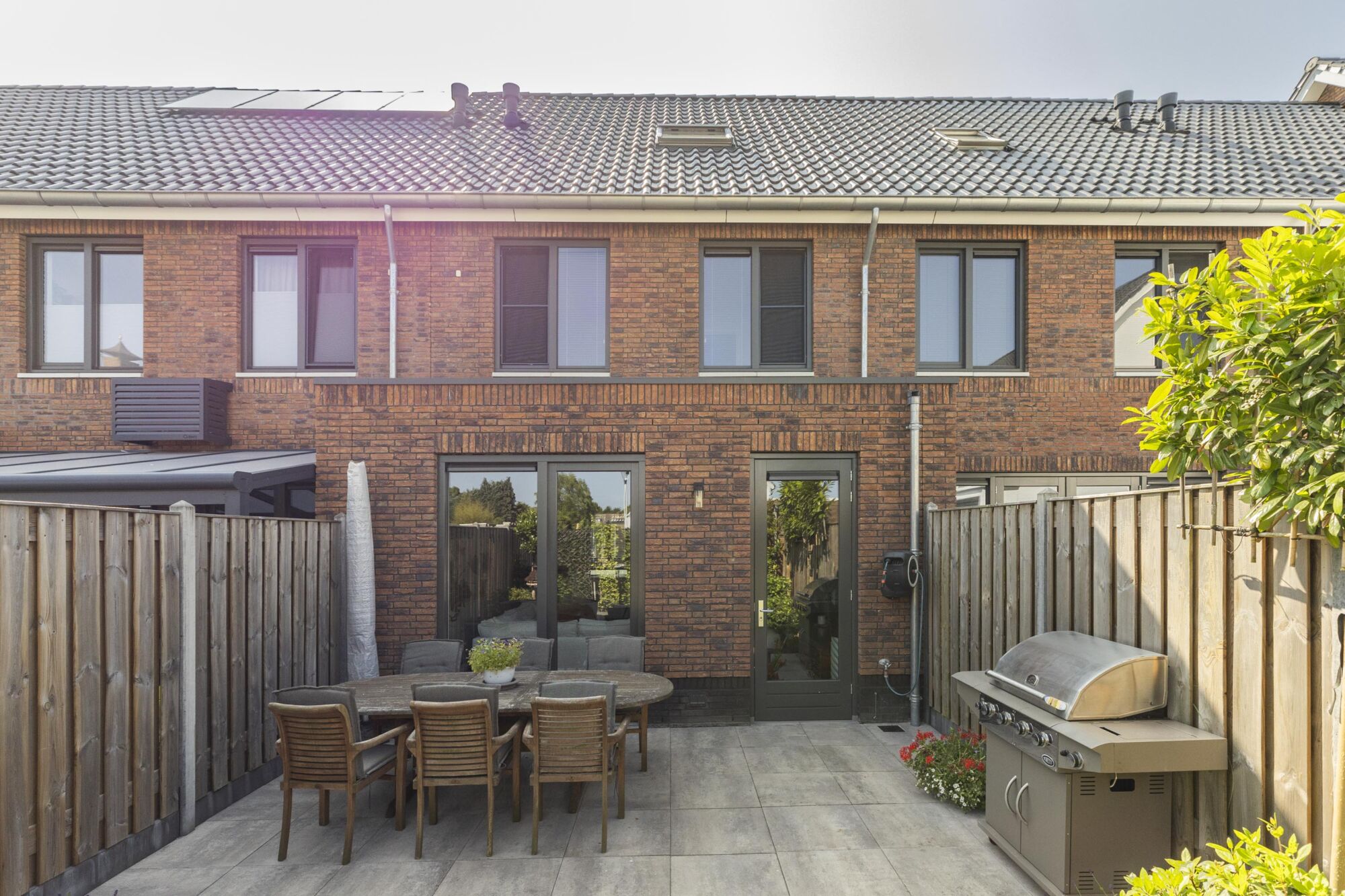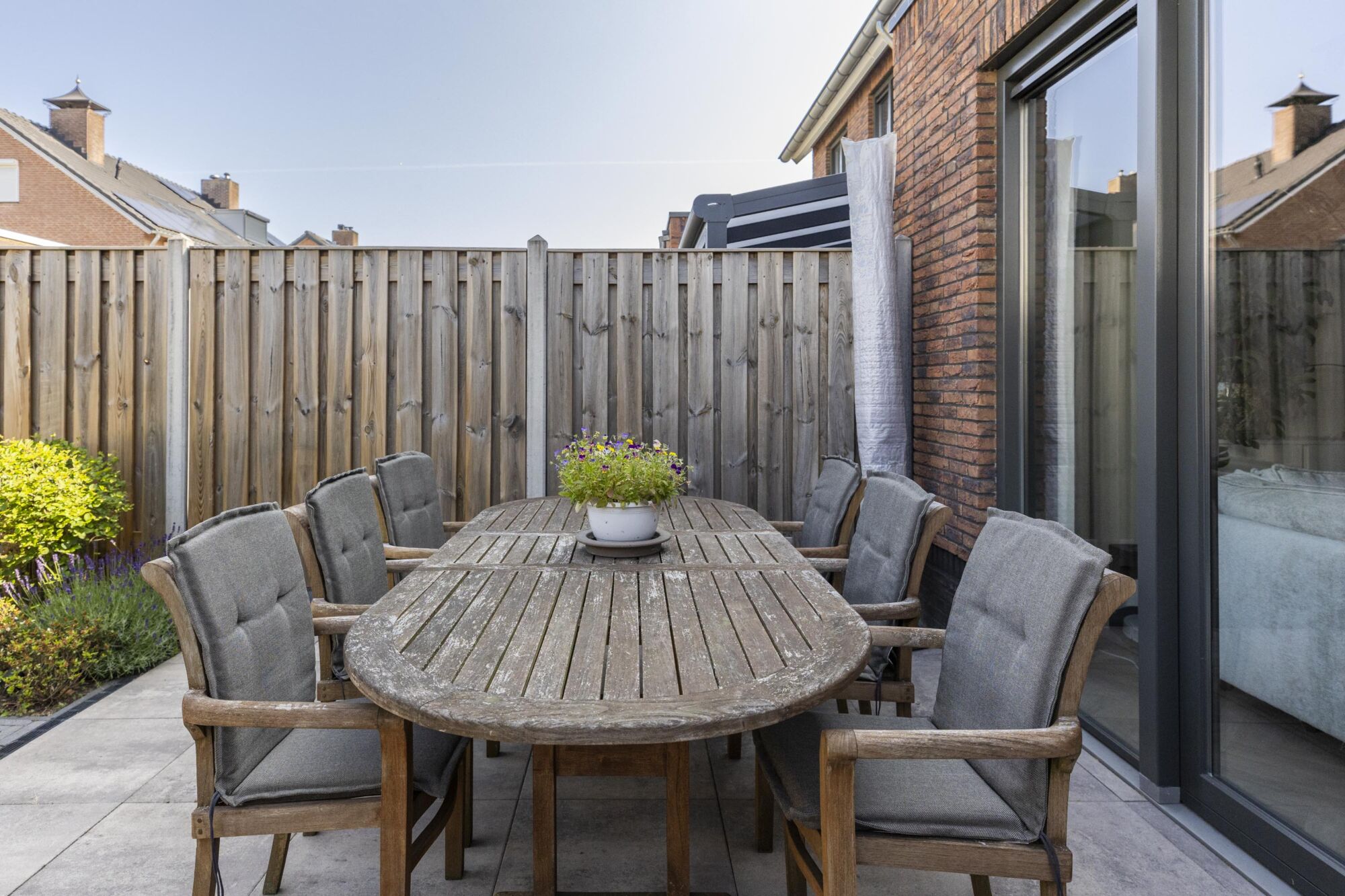 Vanuit de woonkamer loop je via de tuindeur naar de privacy biedende en fijne achtertuin. De achtertuin beschikt over een betegeld terras, een houten berging met elektra aansluitingen en stijlvolle beplanting. In deze tuin geniet u optimaal van de middag- en avondzon vanwege de gunstige en zonnige oriëntatie. Dit, tezamen met de samenstelling van de tuin én de rest van woning creëert een prachtig, sfeervol geheel.