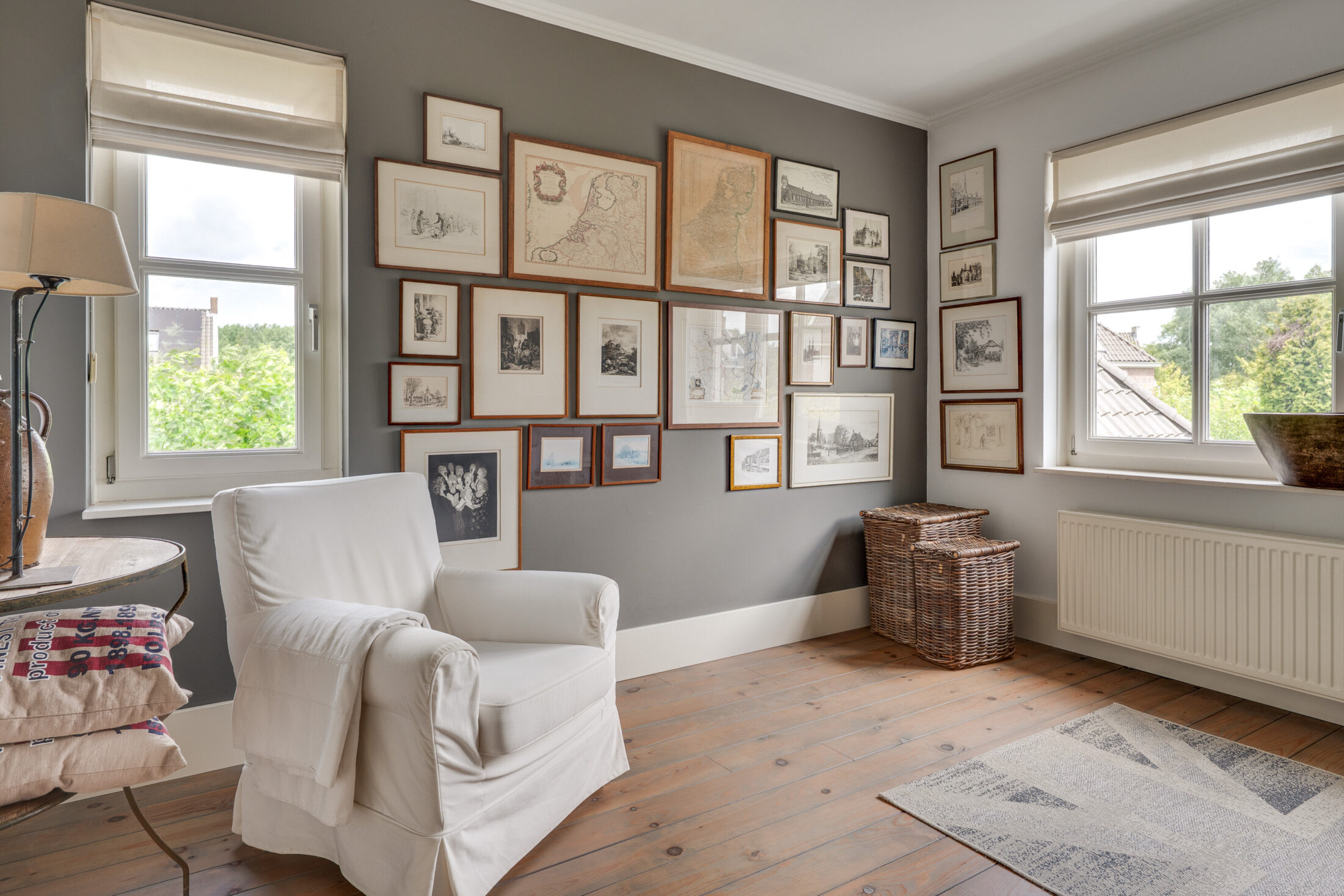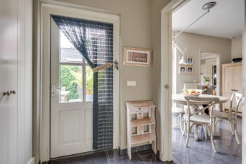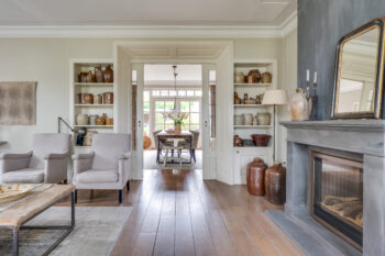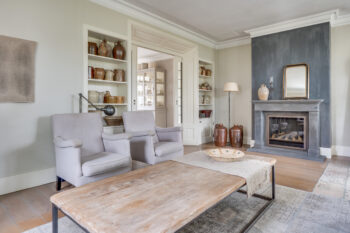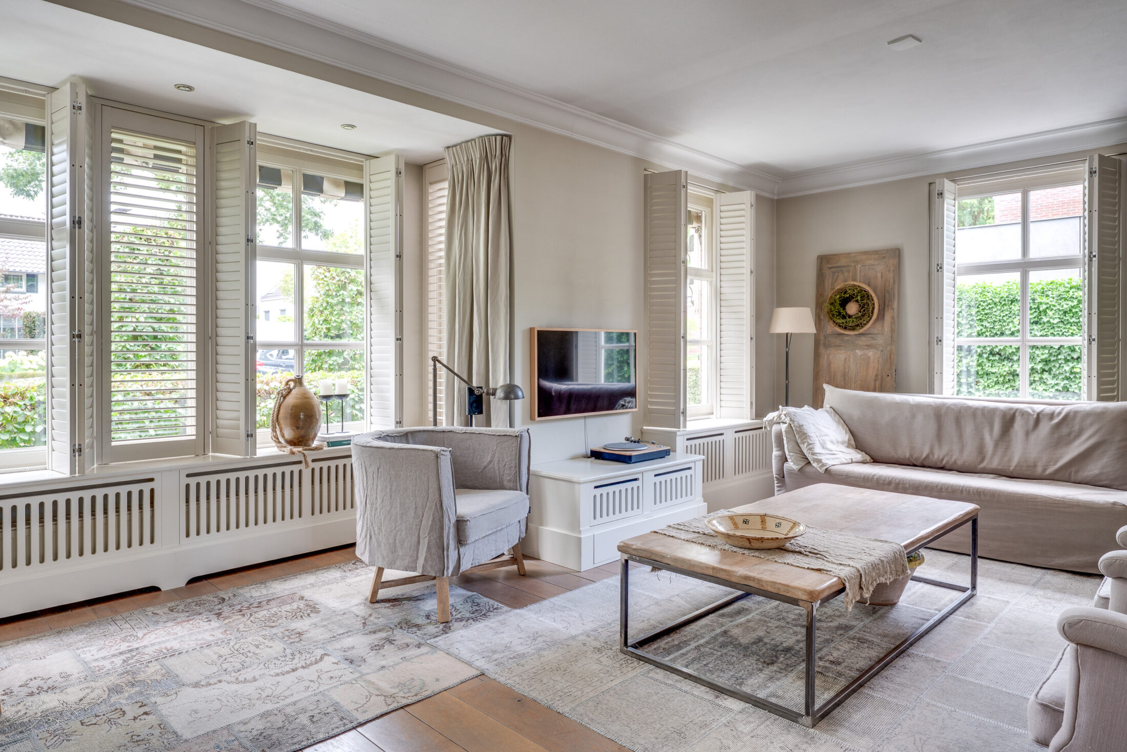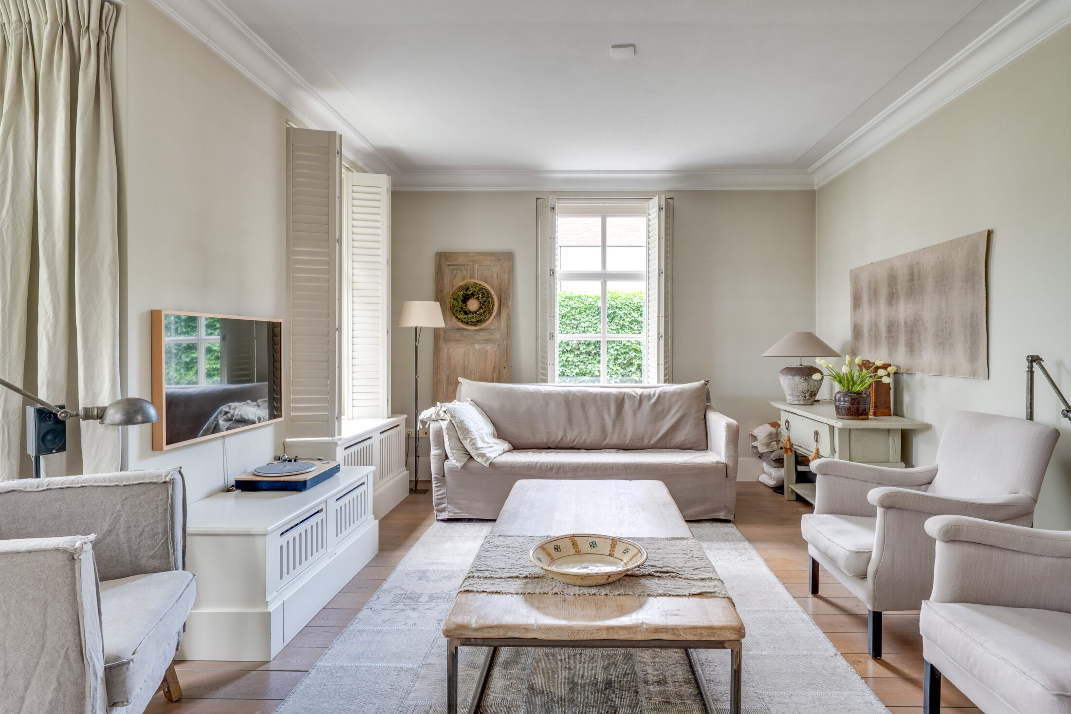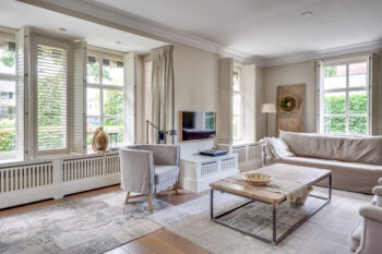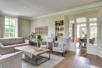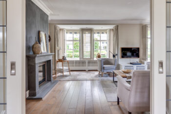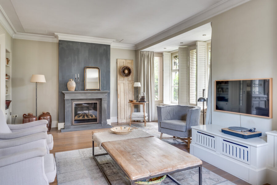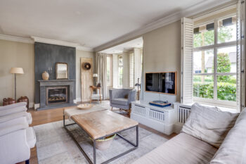 Door de vele raampartijen wordt de prachtig aangelegde en rijkelijk beplante voortuin betrokken in de zithoek. Een echte eyecatcher is de prachtige gashaard met stijlvolle ombouw, die vanwege de donkerdere kleur t.o.v. de rest van de wanden echt in het oog springt. Verder zijn hier dezelfde vloer en plafondafwerkingen te vinden als in de hal. De tevens op maat gemaakte radiator ombouwen en shutters maken het sfeerbeeld compleet.