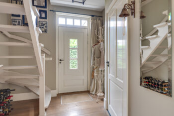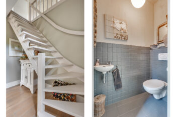 De hal geeft u toegang tot de toiletruimte, woonkamer en de trapopgang naar de eerste verdieping. De gehele woning is qua stijl en afwerking in balans. Het toilet is voorzien van een combinatie van stucwerk en kleine, donkergekleurde tegels, een wandcloset en een fonteintje, compleet in dezelfde landelijke stijl die u in de gehele woning ervaart.