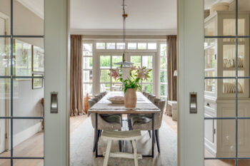 De ruime living wordt door prachtige ensuite schuifdeuren verwerkt in stijlvolle ingebouwde (servies)kasten verdeeld in een eet- en loungegedeelte. Het loungegedeelte bevindt zich aan de voorzijde van de woning.