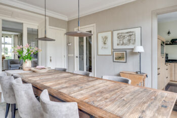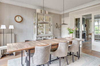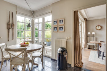De eetkamer kijkt via dubbel openslaande tuindeuren mooi uit over de achtertuin. Door de tuindeuren open te zetten wordt het voorste terras verbonden met de eetkamer. Deze ruimte is meer dan groot genoeg om een royale eettafel te plaatsen.