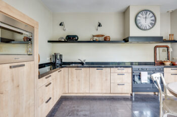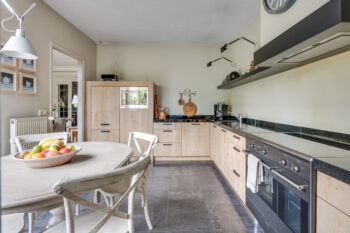 De dichte keuken, gelegen aan de achterzijde, biedt vanwege het formaat plaats voor een eethoek. De houtlook fronten leggen dan weer de connectie met de eiken plankenvloer in de living. De grote L-vormige keuken is voorzien van onderkasten, maar biedt vanwege haar formaat toch meer dan genoeg kastruimte. De keuken is voorzien van een inductiekookplaat met twee ingebouwde ovens, een designafzuigkap, een vaatwasser, een koelvries-combinatie en een spoelbak.