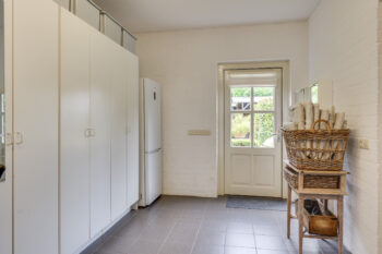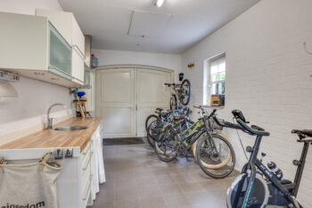 De bijkeuken huisvest een grote ingebouwde kastenwand en biedt toegang tot de volledig geïsoleerde garage compleet met bergvliering en de achtertuin. De garage is voorzien van een oud keukenblok compleet met spoelbak. Deze ruimte is volledig geïsoleerd en zou derhalve ook goed kunnen fungeren als hobby- of kantoorruimte. Met een vlizotrap bereikt u de bergzolder die boven de gehele garage te vinden is. De garage is voorzien van elektra- en wateraansluitingen en huisvest o.a. de C.V.-ketel.