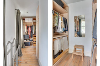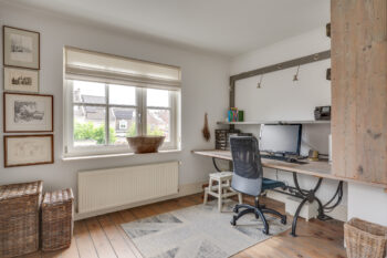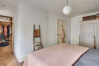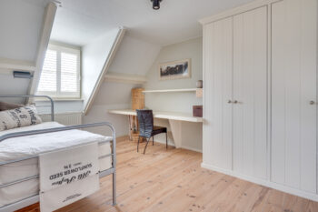 Hier is ruimte gereserveerd voor royale kledingkasten die uit het directe zicht zijn onttrokken. De andere slaapkamer op de eerste verdieping is gelegen aan de achterzijde van de woning en is eveneens ruim bemeten. Met zo’n 12 m2 is ook deze slaapkamer meer dan groot genoeg om een tweepersoonsbed, garderobekast en ander meubilair te plaatsen.