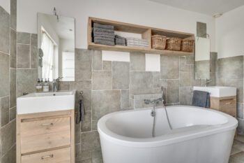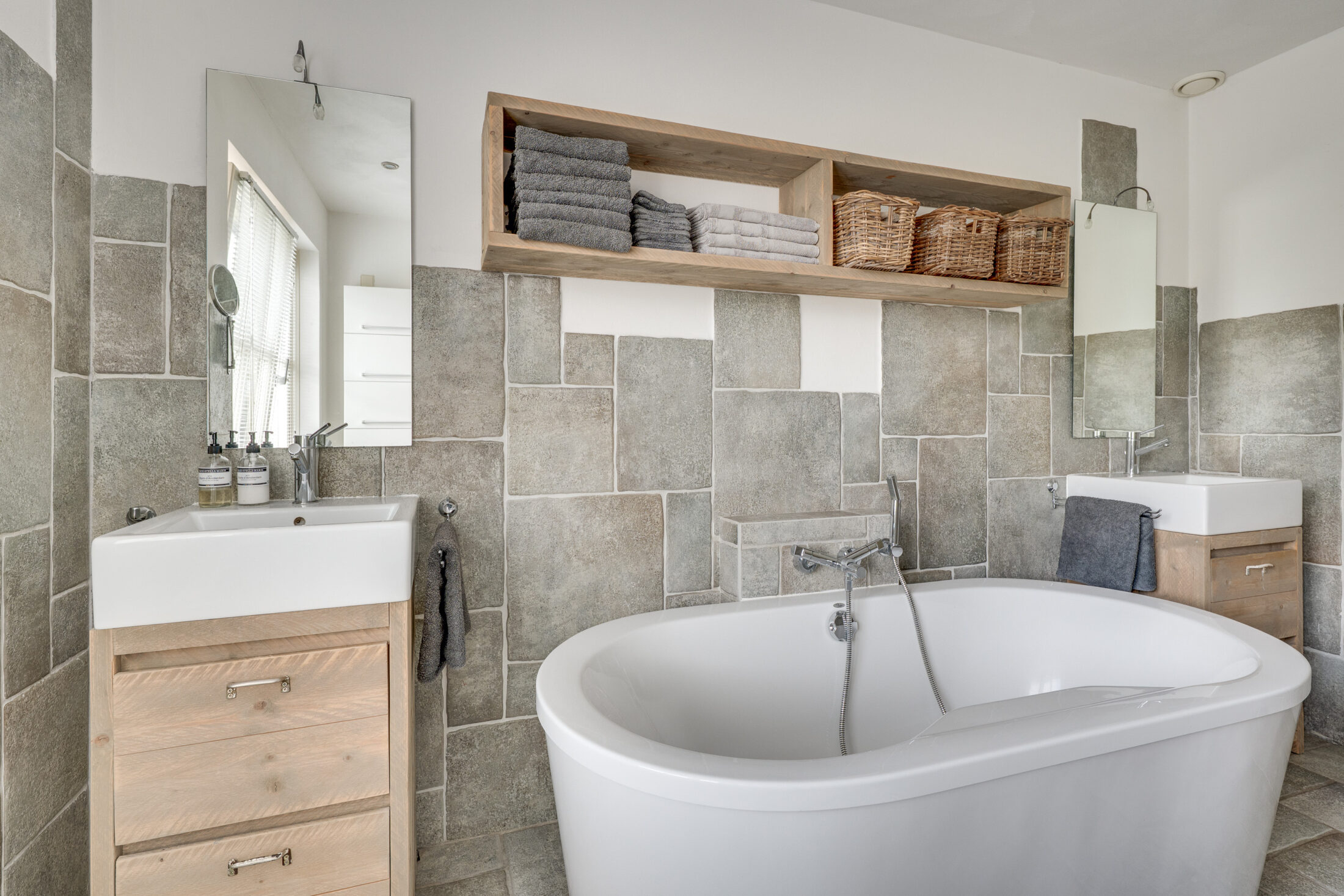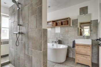Deze prachtig afgewerkte badkamer ademt rust en comfort dankzij het gebruik van grote, natuursteen-look tegels in een warme grijstint. De ruimte is voorzien van een moderne inloopdouche, stijlvol geïntegreerd in een halfopen wand die privacy biedt zonder het open gevoel te verliezen. Centraal in de badkamer bevinden zich een elegant vrijstaand ligbad, ideaal om heerlijk te ontspannen. De houten wastafelmeubels maken het geheel compleet.