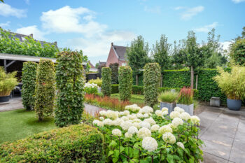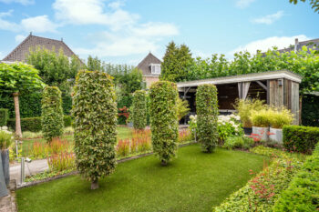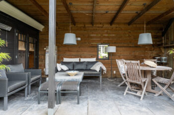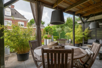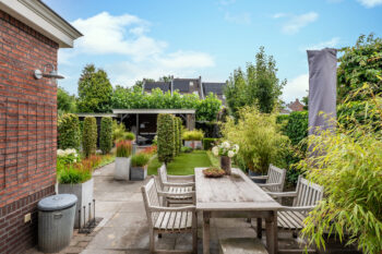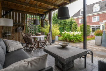 Er zijn verschillende terrasmogelijkheden gerealiseerd en tegelijkertijd meer dan genoeg ruimte voor prachtige groene tuinaankleding. Zo is er direct aan de eetruimte een betegeld terras te vinden waar u tuinmeubilair kunt plaatsen, maar kunt u ook onder de overkapping heerlijk van uw tuin genieten. Deze overkapping met verstelbare lamellenwand geldt niet alleen als overdekt terras. Ingebouwd in de overkapping bevindt zich namelijk een heerlijke sauna! Na een bezoek aan de sauna kunt u zich onder de buitendouche afspoelen. Bent u nieuwsgierig geworden? Plan dan snel een bezichtiging in!
