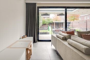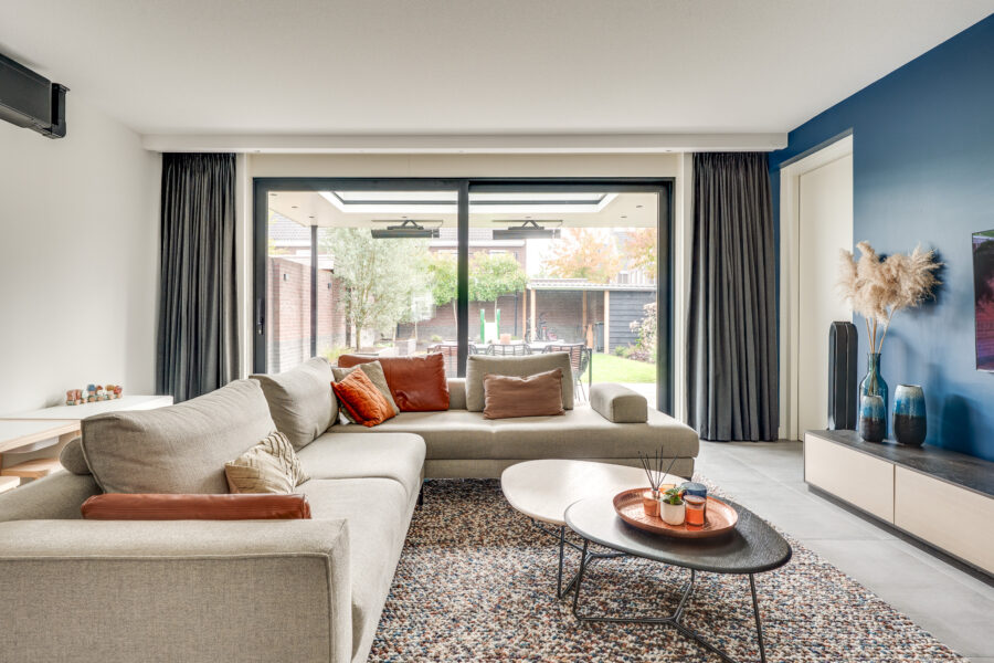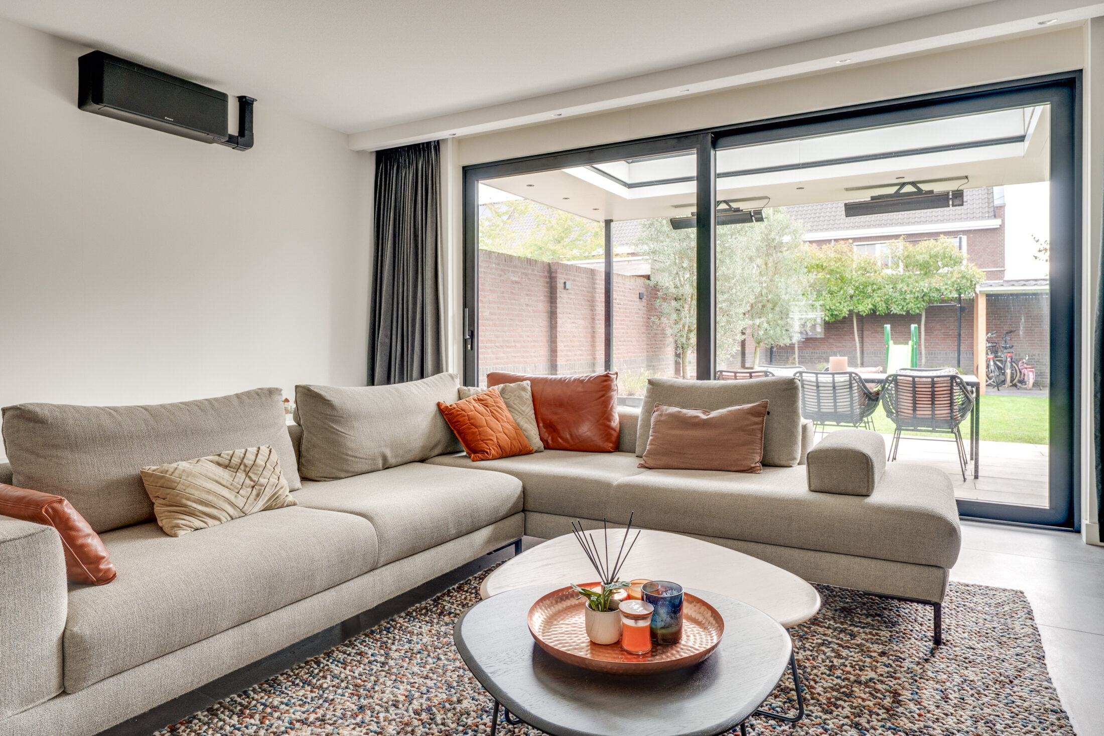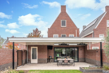 Vanuit de zithoek in de woonkamer krijgen we via een prachtige en grote schuifpui toegang tot de terrasoverkapping welke over de gehele breedte van de woning is gerealiseerd. Een overkapping als deze zien wij maar zelden en betreft de absolute eyecatcher van deze fijne woning.