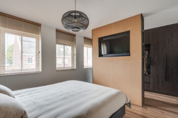 Aan de voorzijde van deze fijne woning bevindt zich over de gehele breedte de master-bedroom, prachtig aangekleed, ruim van opzet en voorzien van een scheidingswand waar mogelijk een televisie opgehangen kan worden. Deze scheidingswand verzorgt een inloopkast en straalt luxe uit. Een uitermate prettige ouderslaapkamer!