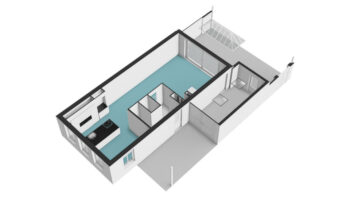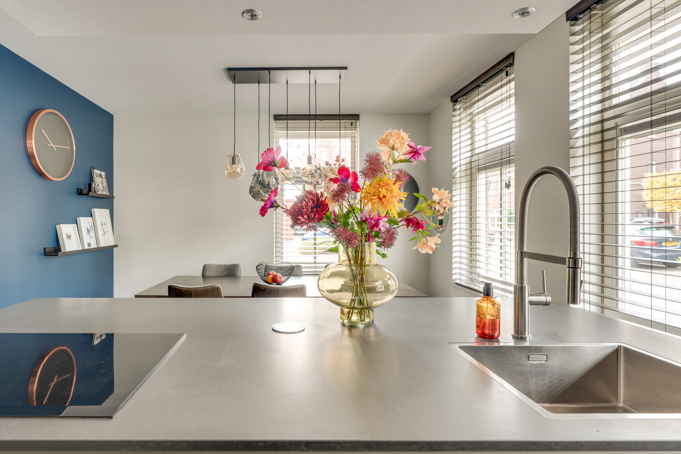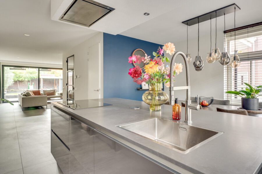 In open verbinding met de woonkamer bevindt zich de woonkeuken. Voorzien van de ruimte een gezellige dinertafel te plaatsen en daarbij voorzien van veel daglichtinval dankzij de raamkozijnen rondom. De keuken is voorzien van een installatiewand en een kookeiland waar veel berg- en werkruimte aanwezig is. Aan inbouwapparatuur treffen we: