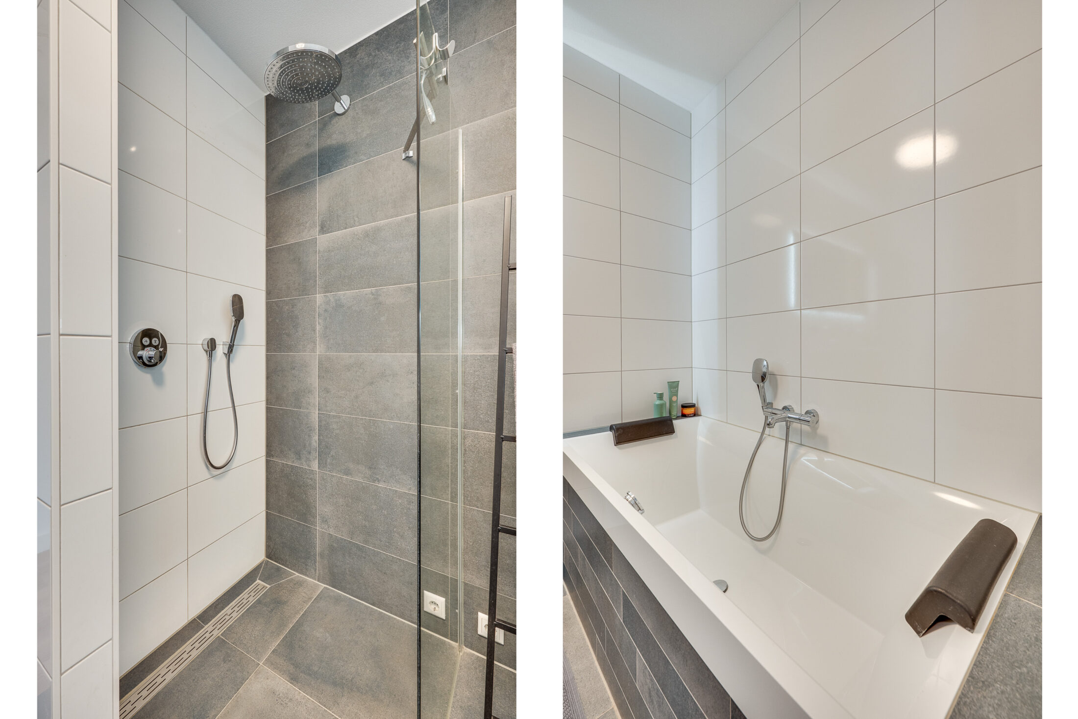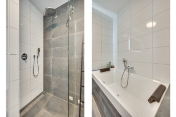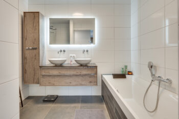 Via een schuifdeur bereiken we de moderne badkamer, voorzien van strakke wand- en vloertegels, een ruim ligbad, dubbele wastafel in meubel en tevens voorzien van inbouwkranen. Aan de overzijde bevindt zich de inloopdouche voorzien van regendouche en een handdouche. Deze badkamer is daarbij zeer goed onderhouden.