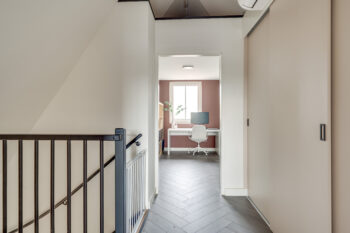 Via de moderne trapopgang, welke zeer netjes bekleed is, bereiken we de lichte overloop van de eerste verdieping vanwege de aanwezigheid van een raamkozijn. Deze overloop biedt toegang tot de eerste en tweede slaapkamer, de badkamer, de wasruimte, separate toiletruimte en de trapopgang richting de tweede verdieping.