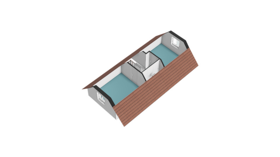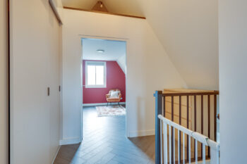 De vaste trap aan de overloop biedt toegang tot de overloop van de tweede verdieping. Deze overloop biedt toegang tot de technische ruimte, slaapkamers drie en vier en een bergzolder boven deze slaapkamers.