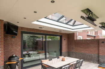 – Een grote terrasoverkapping over de gehele breedte met geluidssysteem, verlichting, terrasheaters en sfeervolle lichtstraat;