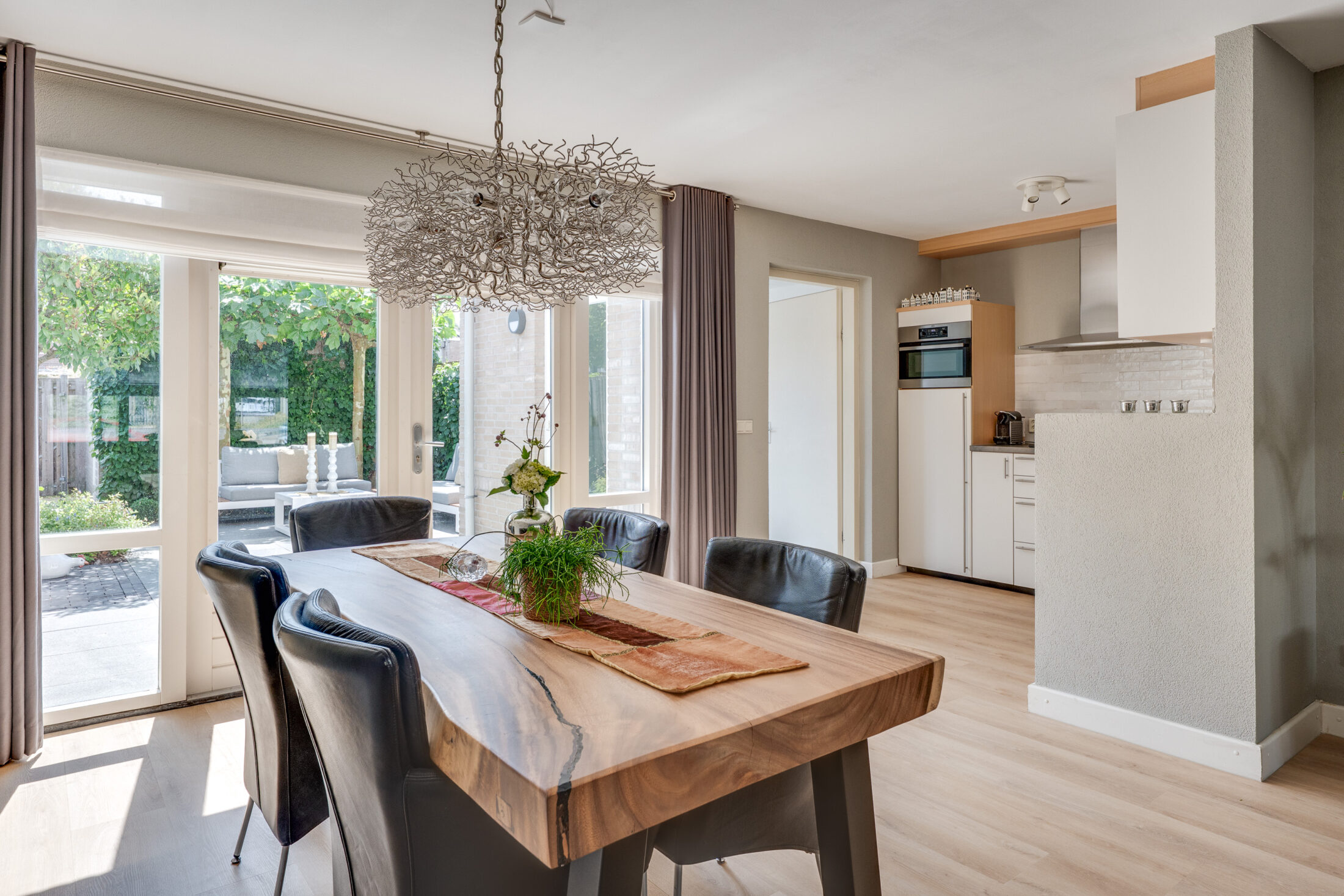 Wat een ruimte en sfeer! De tuingerichte woonkamer is voorzien van grote raampartijen en openslaande tuindeuren naar de tuin waardoor het licht rijkelijk binnenstroomt. Ook hier strak stucwerk en de mooie pvc vloer omlijst met mooie hoge plinten.De tuindeuren geven je toegang tot het zonnige terras