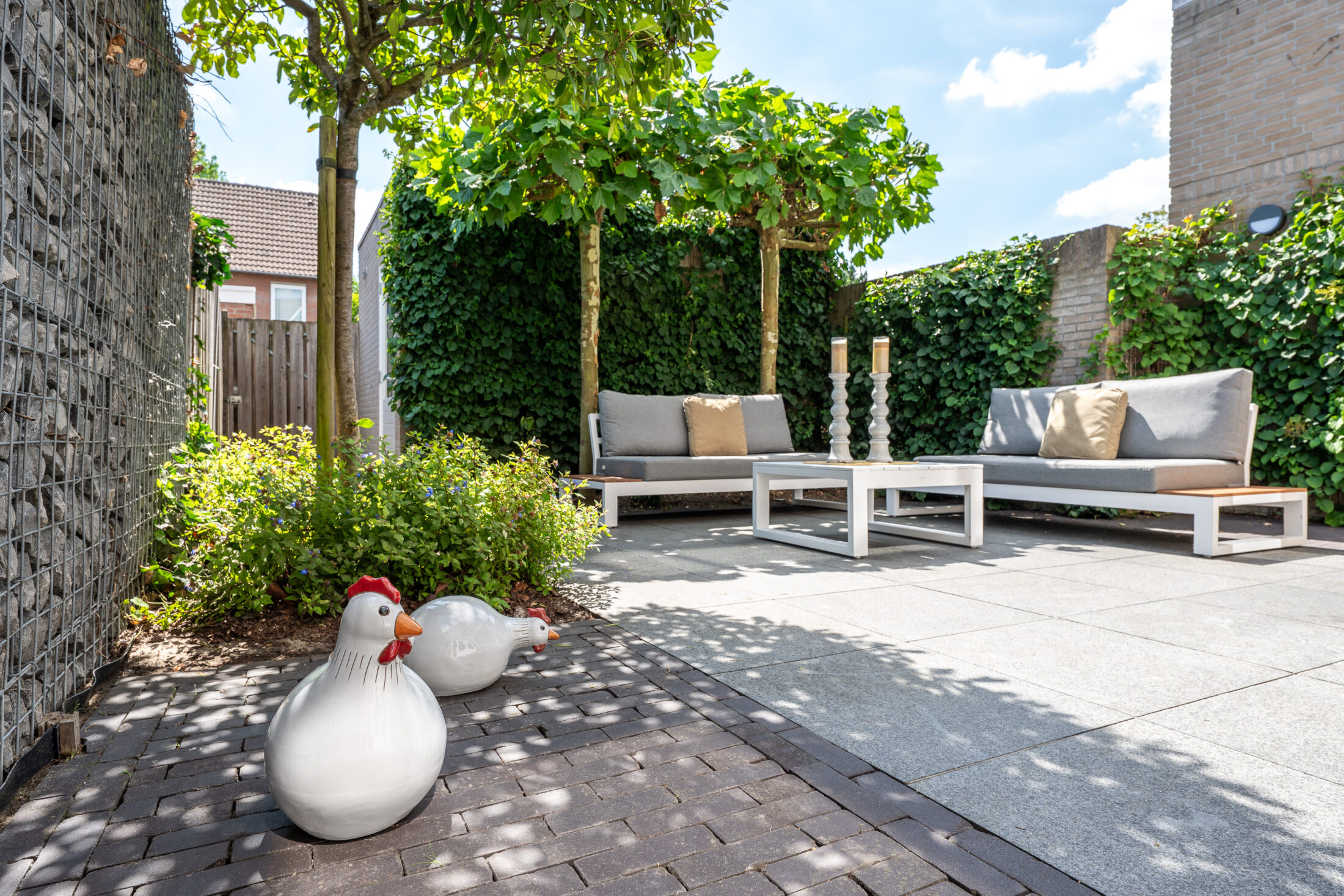 Het terras wordt afgewisseld met een pad naar de poort achterom en vaste beplanting waaronder een aantal leibomen. De tuin ligt op het zuidoosten waardoor je altijd wel ergens zon hebt. De bomen zorgen voor een heerlijke schaduw zodat je elk moment van de dag kunt genieten van deze leuke tuin.