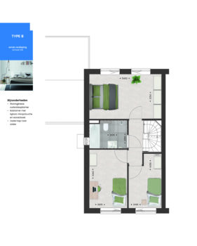 De tweede verdieping biedt diverse indelingsopties. Door het toevoegen van dakkapellen aan de voor- en/of achterzijde kun je hier twee ruime kamers creëren, ideaal voor een extra slaapkamer of een thuiskantoor.