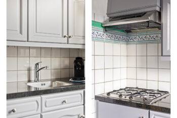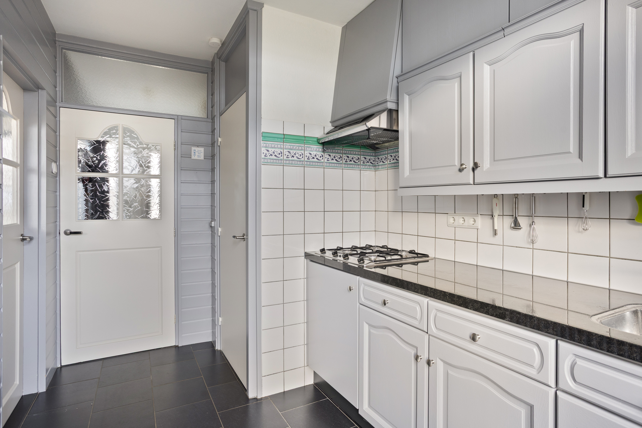 De keuken is praktisch ingericht in een wandopstelling en beschikt over voldoende kastruimte, een gaskookplaat, vaatwasser, afzuigkap en koelkast. Het granieten werkblad geeft de keuken een nette uitstraling. Extra handig is de trapkast: perfect voor voorraad en extra bergruimte.