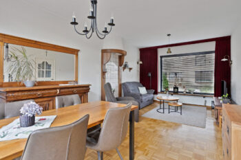 De gezellige doorzonwoonkamer is een fijne leefruimte met een parketvloer en een sfeervolle schouw. Door de grote ramen aan zowel de voor- als achterzijde is het hier heerlijk licht en voelt de ruimte prettig en open aan — een fijne plek om thuis te komen.