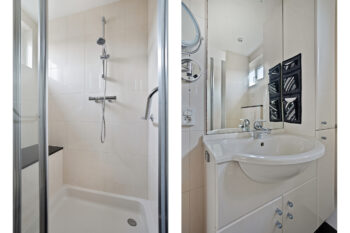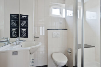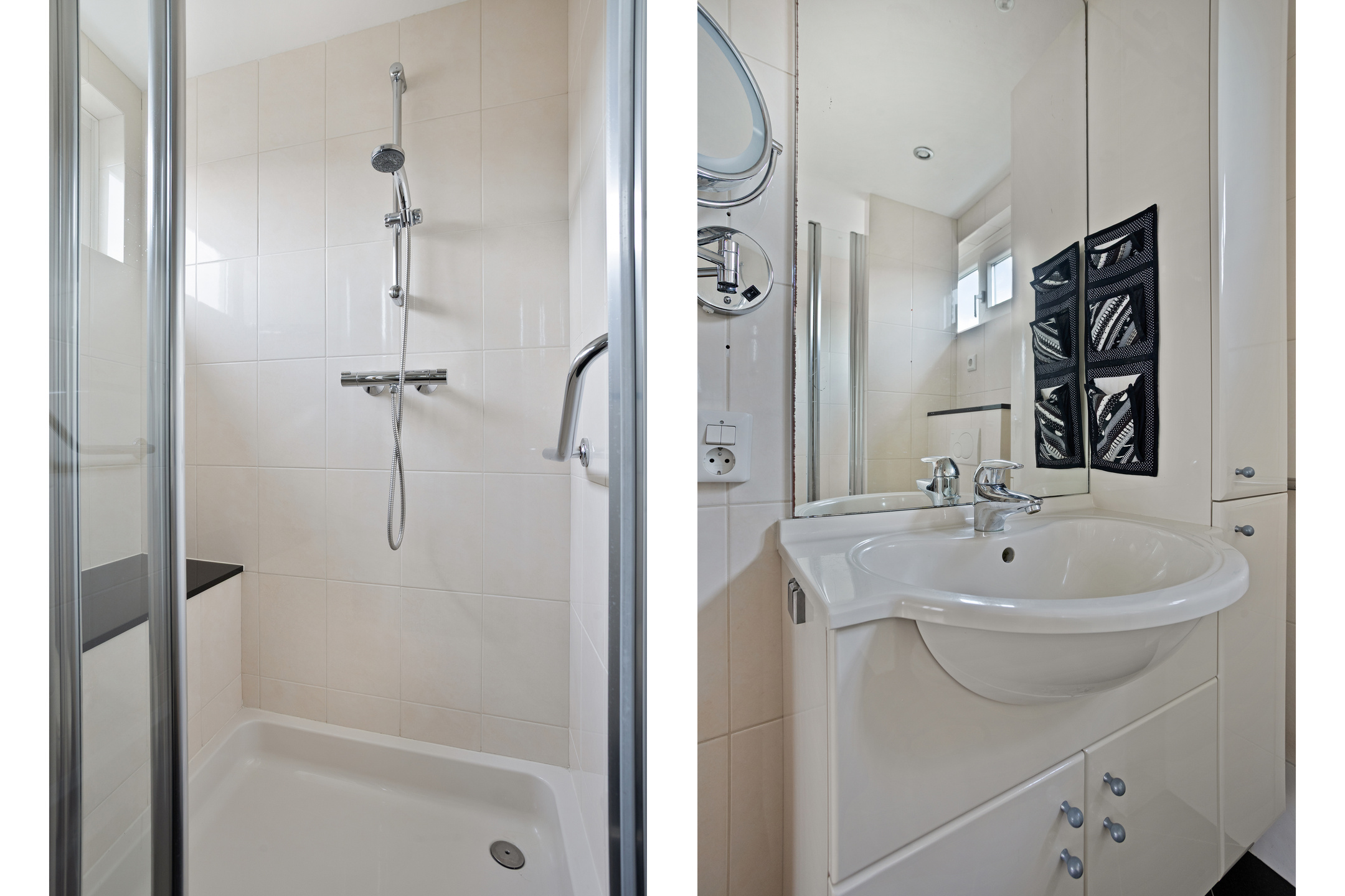 De nette, volledig betegelde badkamer is compleet uitgevoerd met een wandcloset, een wastafelmeubel en een douchecabine. Dankzij het raam is er daglicht en natuurlijke ventilatie.