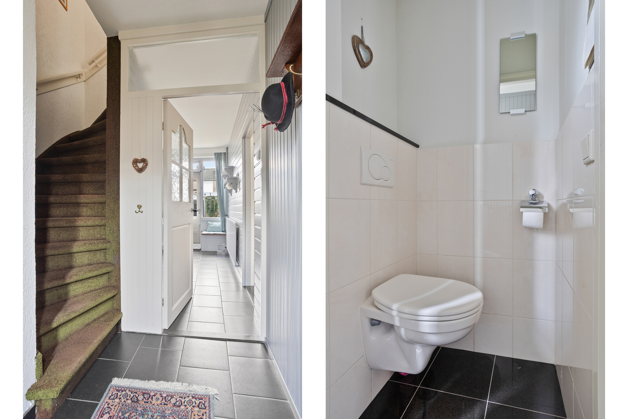 Je komt binnen in de hal met toegang tot het moderne, deels betegelde toilet met wandcloset, de meterkast en de trap naar boven.