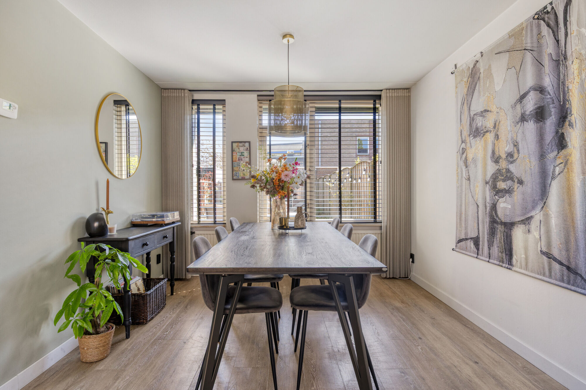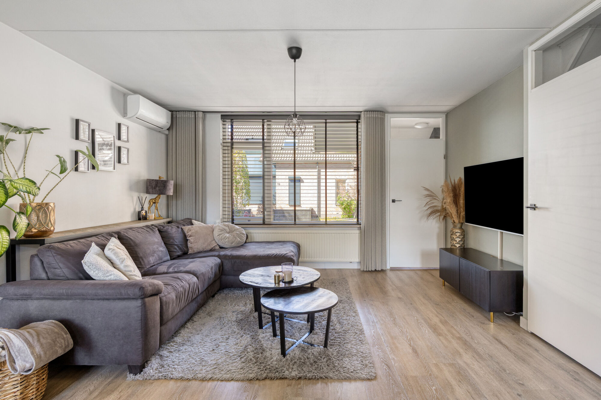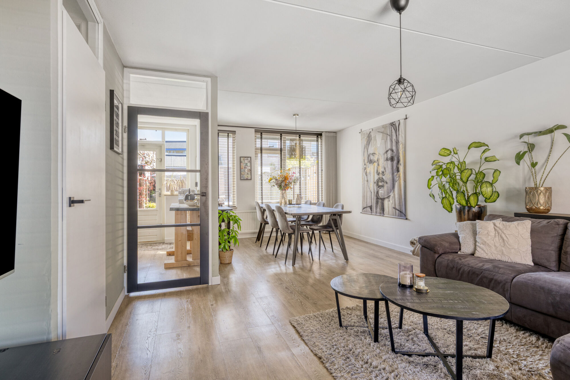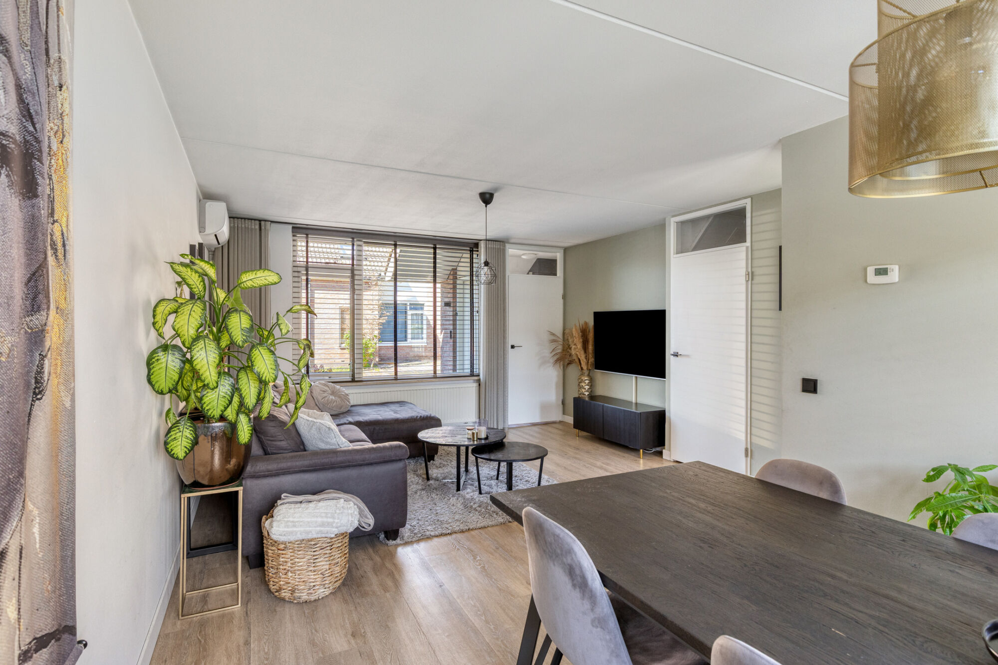 De ruimte is afgewerkt met een stijlvolle houtlook PVC-vloer, hoge witte plinten en glad gestucte wanden, en biedt bovendien extra comfort door aanwezige airconditioning. Aan de voorzijde is er ruimte voor een royale hoekbank met salontafels en een televisiemeubel, terwijl de achterzijde van de begane grond perfect is ingericht voor een grote eettafel met meerdere stoelen – ideaal voor gezellige diners of borrels.