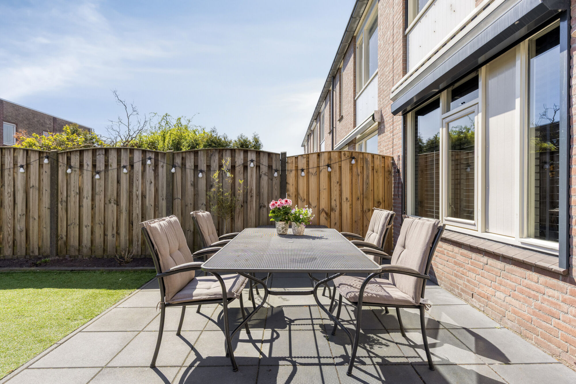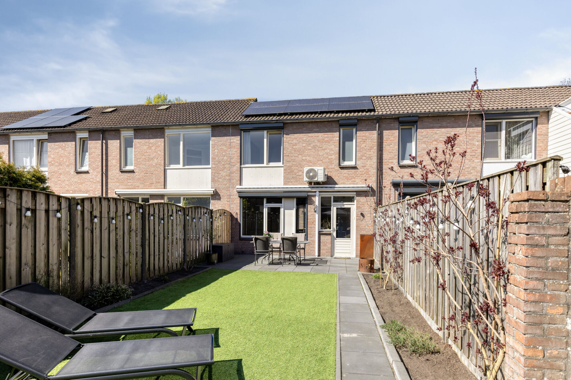 De buitenruimte is met zorg en aandacht aangelegd en biedt een ideale combinatie van tegels, kunstgras en aan weerszijden fraaie borders voor beplanting. Een grote en brede luifel zorgt ervoor dat u altijd in de schaduw of beschut kunt zitten. Er is voldoende plek gecreëerd voor een terras, waar eenvoudig een tuin- of loungeset geplaatst kan worden. Dankzij de ligging op het zuidoosten is er op elk moment van de dag wel ergens zon in de tuin, waardoor meerdere zit- of ligplekken goed tot hun recht komen. Tot slot is er een praktische achterom met houten poort aanwezig.