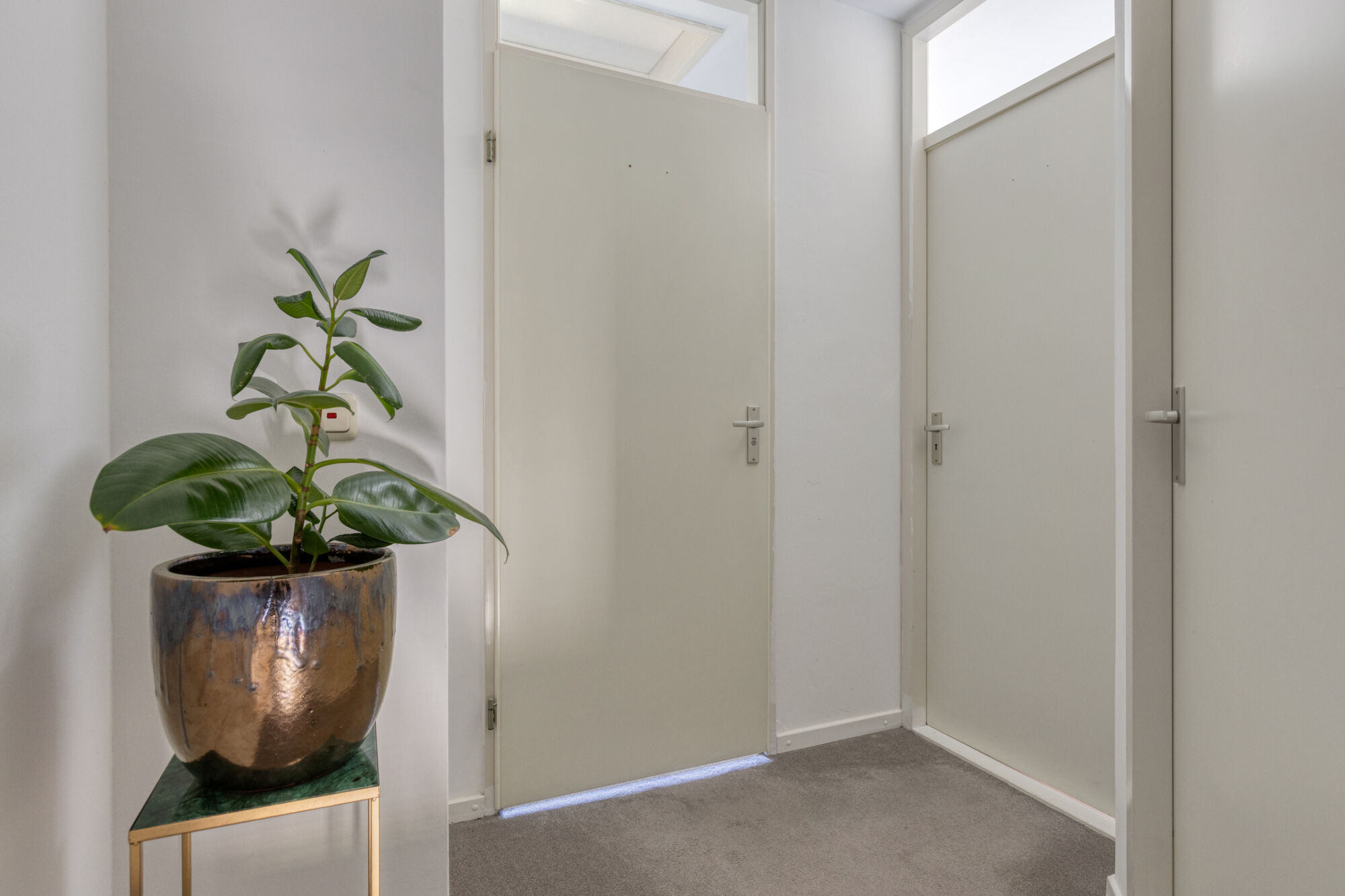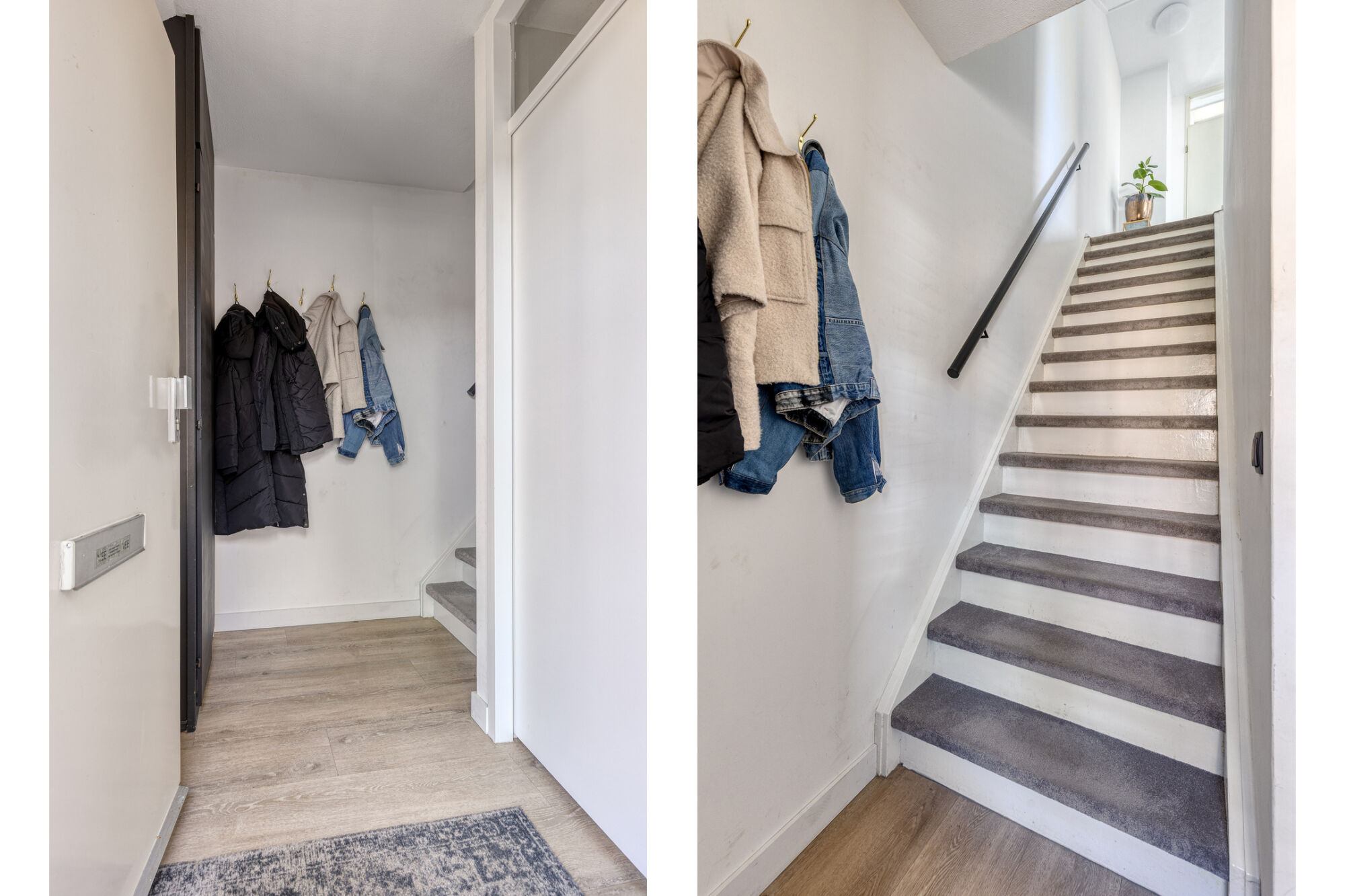 U betreedt de woning via de karakteristieke voordeur, beschut onder een stijlvolle doorlopende kap. De entreehal geeft toegang tot de vaste trapopgang naar de eerste verdieping en de meterkast is hier gesitueerd.