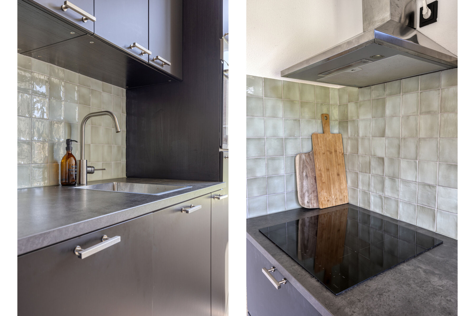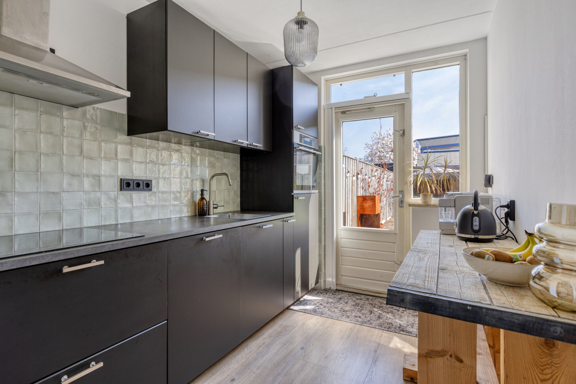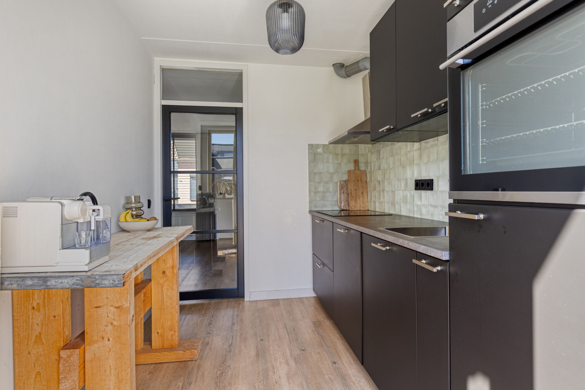De keuken is op een praktische manier afgesloten, maar dankzij de glazen deur blijft er een prettige visuele verbinding met de woonkamer, waardoor ook hier veel daglicht binnenvalt. De keuken is opgesteld langs één wand, met voldoende ruimte voor extra kastruimte of het creëren van een gezellige koffie- en theehoek. U beschikt over alle moderne inbouwapparatuur, waaronder een koelkast, oven, inductiekookplaat, afzuigkap, vaatwasser en spoelbak.