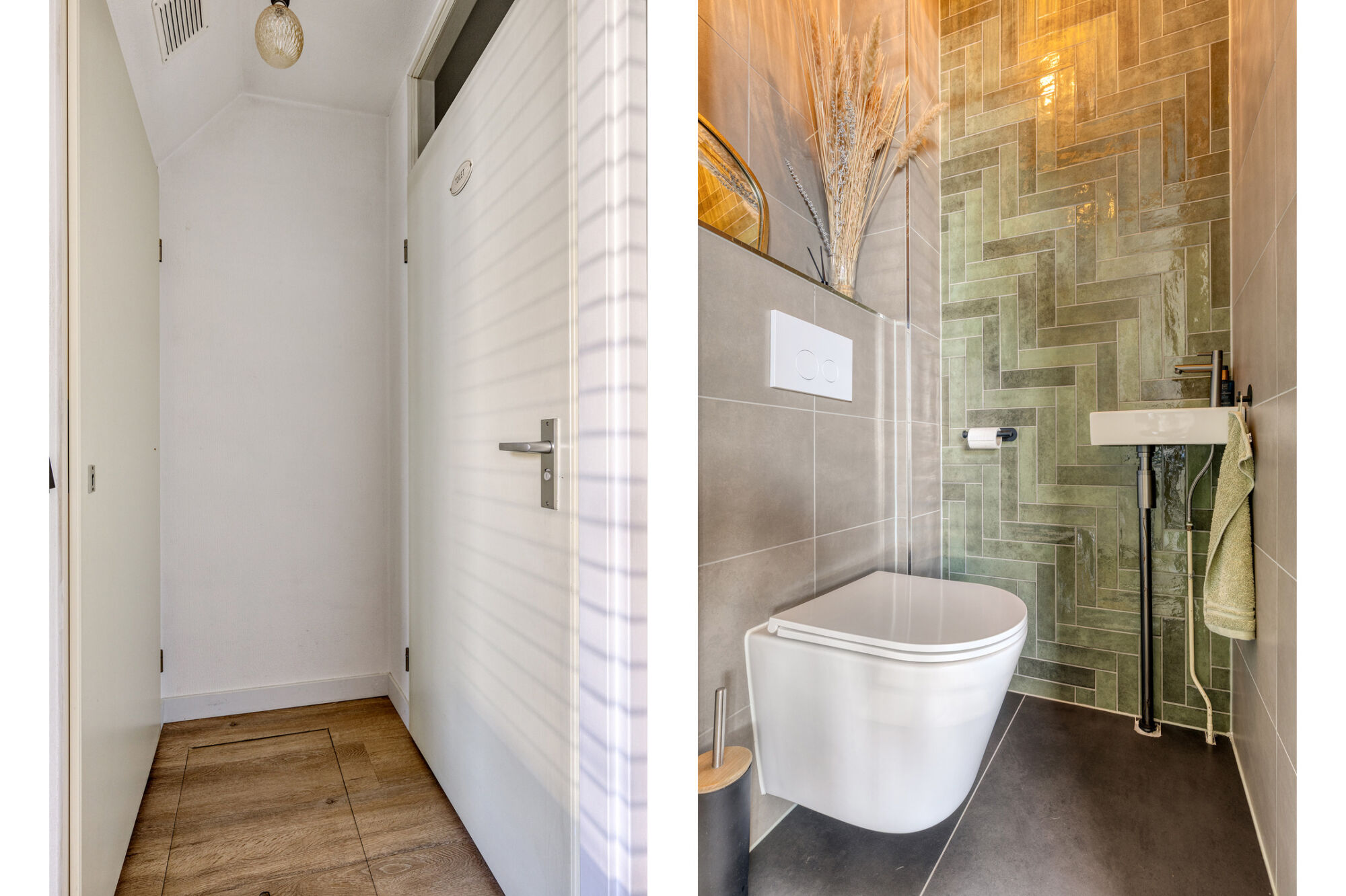 Via een portaal in de woonkamer bereikt u het gastentoilet en de praktische provisieruimte onder de trap. Het toilet is modern afgewerkt met fraaie tegeltjes en nieuw sanitair, terwijl de provisieruimte ideaal is voor al uw huishoudelijke spullen.