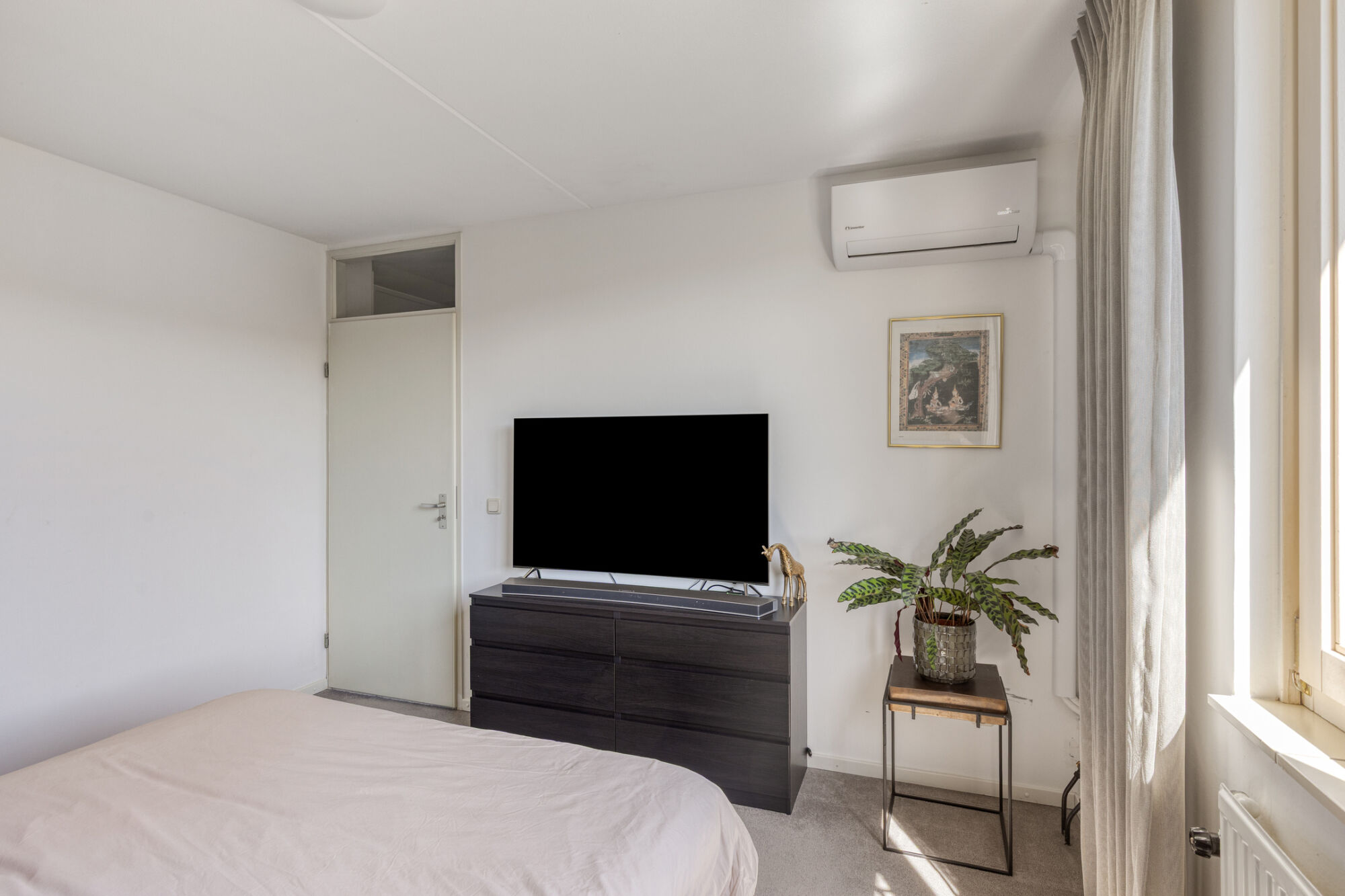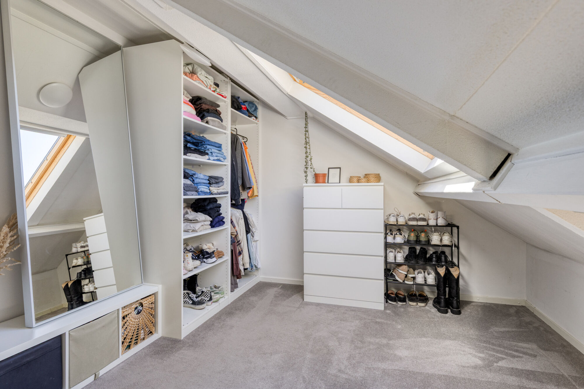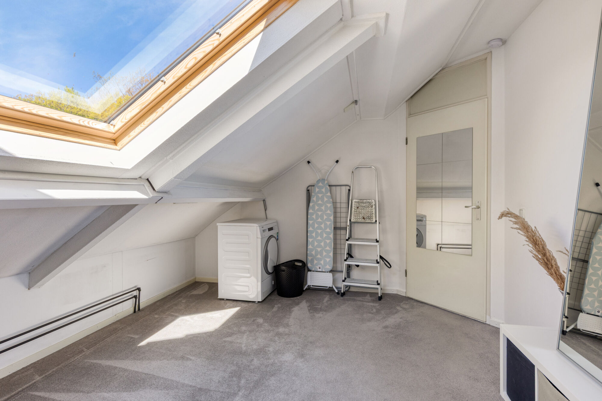 De tweede slaapkamer wordt momenteel gebruikt als kastenkamer, maar dankzij het formaat en het grote dakraam leent deze ruimte zich ook uitstekend als (kinder)slaapkamer, thuiswerkplek of hobbykamer. Het dakraam zorgt voor optimale ventilatie en veel daglicht, waardoor deze kamer een fijne, multifunctionele ruimte is.