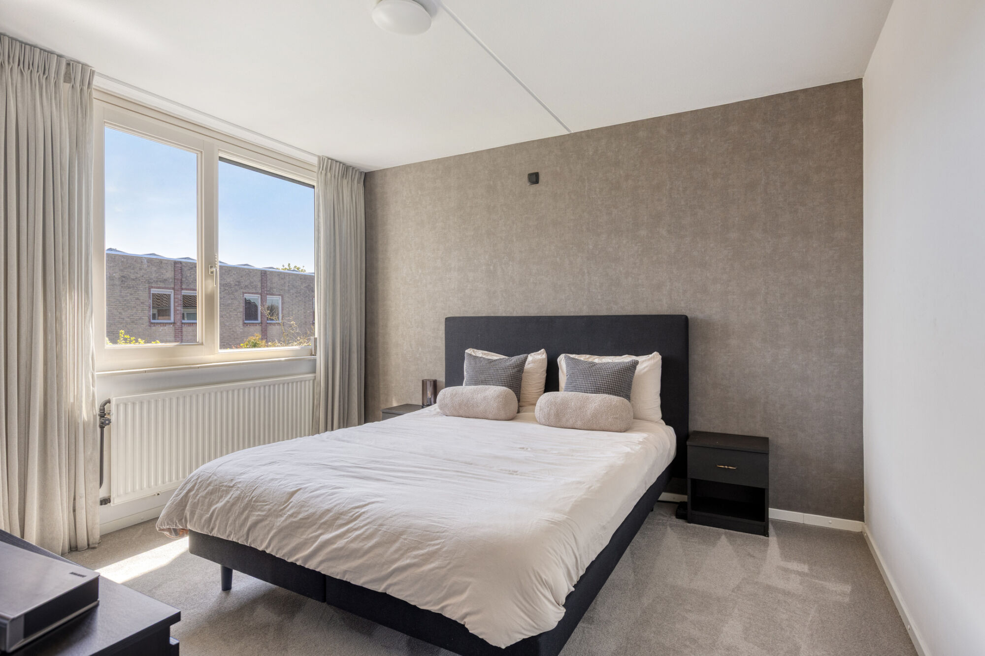 Op de eerste verdieping vindt u een ruime, lichte hoofdslaapkamer, hoogwaardig afgewerkt en voorzien van comfortabele vloerbedekking. Er is voldoende plek voor een groot tweepersoonsbed, nachtkastjes en extra meubels zoals een dressoir. Voor extra comfort is er airconditioning aanwezig, prettig in zowel de zomer- als wintermaanden.