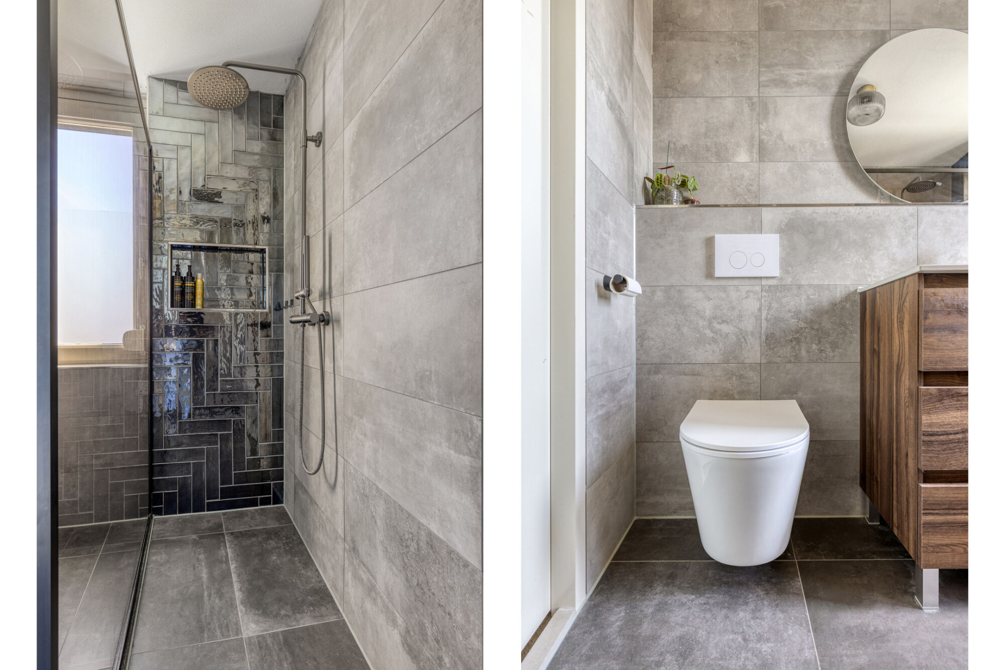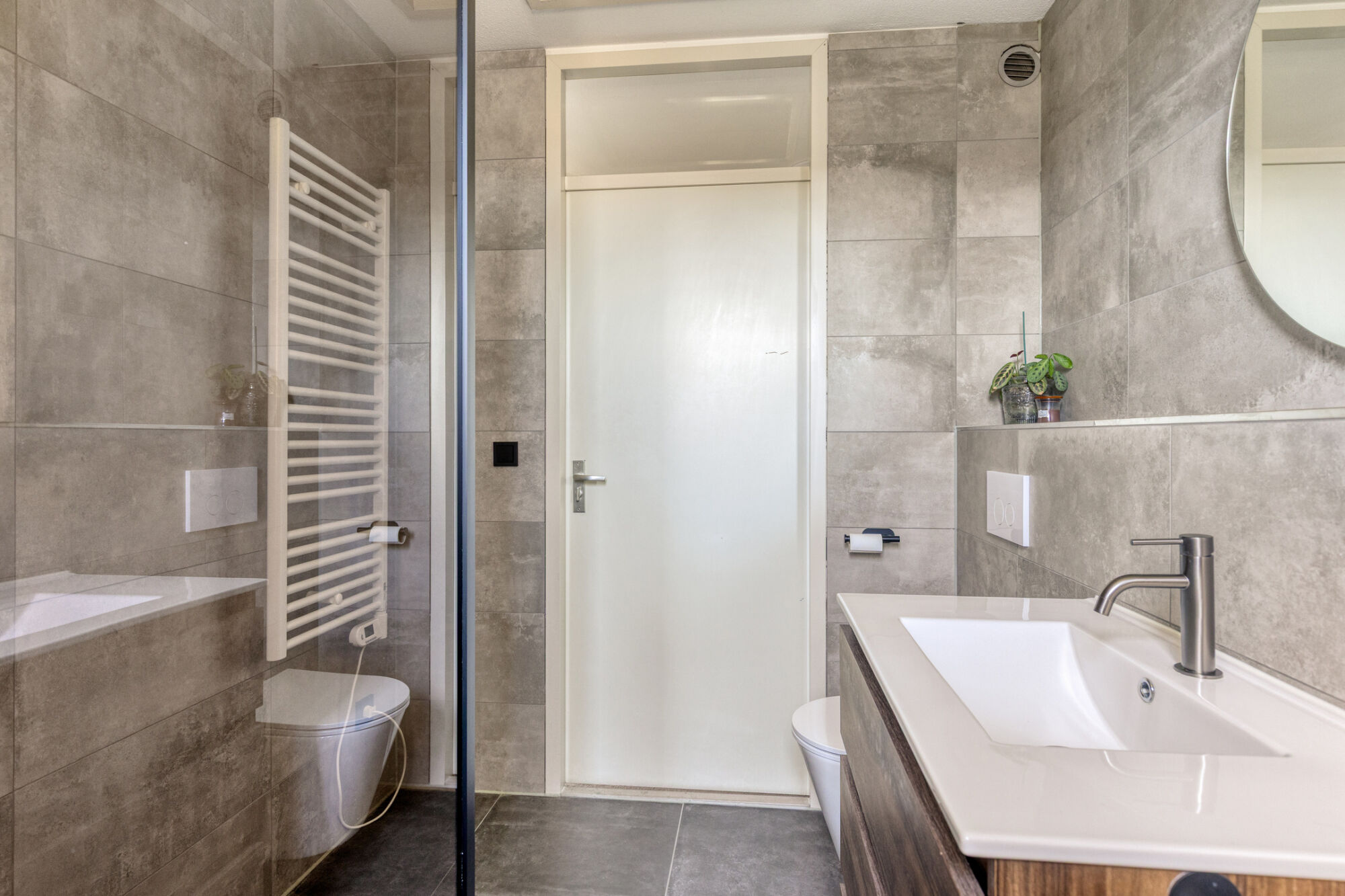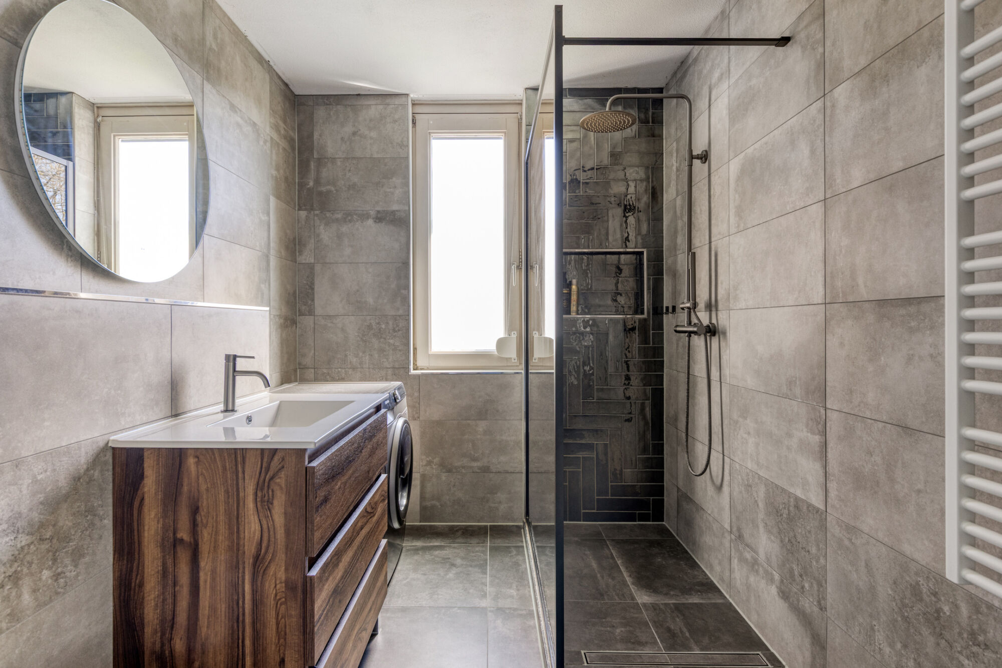 De badkamer is een echte eyecatcher en modern afgewerkt met luxe voorzieningen. Er is een ruime inloopdouche met glazen wand en nis, een wastafel met houtlook meubel, hangend toilet en designradiator. Ook zijn er aansluitingen voor wasmachine en droger, wat de ruimte praktisch maakt. Het raam zorgt voor licht en ventilatie en heeft een rolluik. Vanuit de badkamer is via een luik met losse trap toegang tot de opbergzolder.