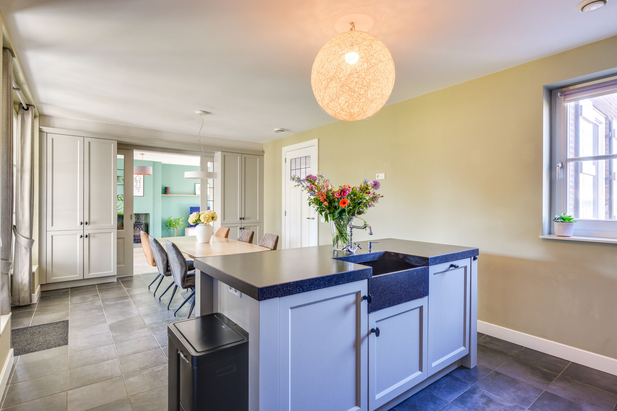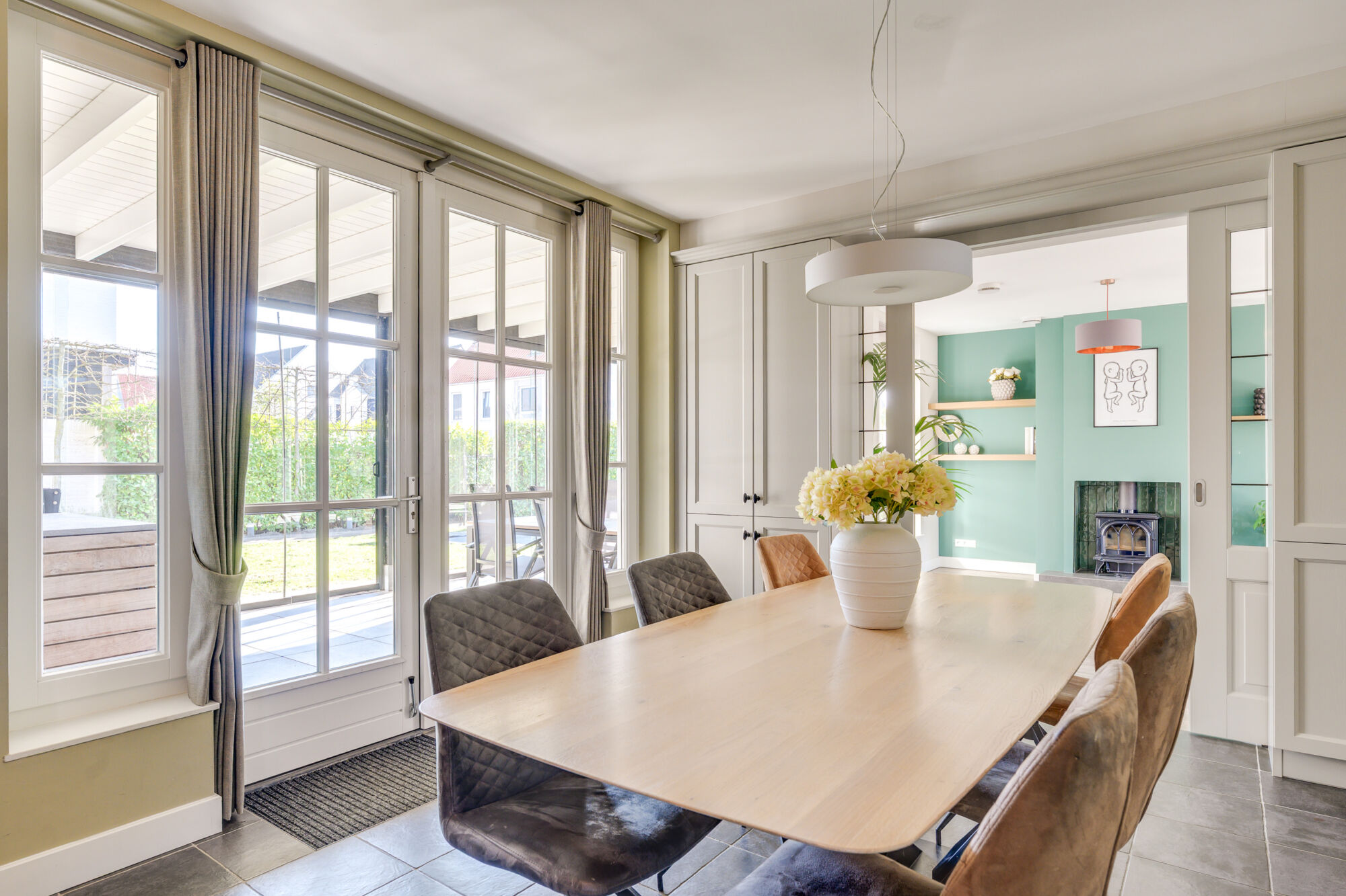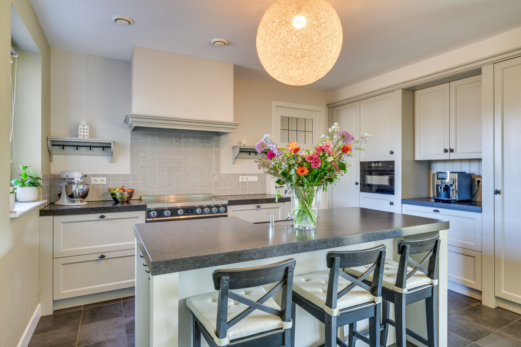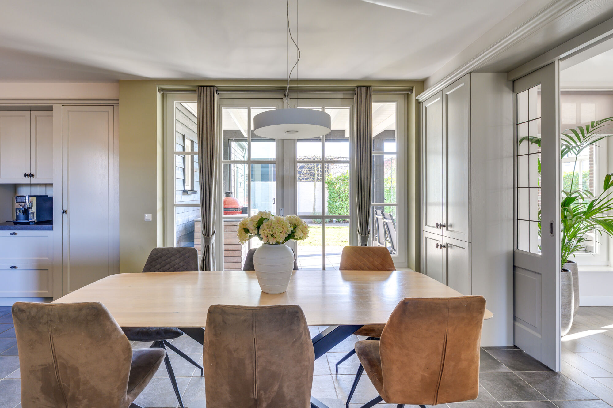 In de klassieke woonkeuken is voldoende ruimte om een grote eettafel neer te zetten. Met recht spreken we hier over het hart van de woning. Hier zit u gezellig met vrienden en familie te borrelen en te eten. De keuken is voorzien van een vaatwasser, koelkast, afzuigkap, inductie kookplaat, grote oven, combi-oven, combi-magnetron en een close in boiler.