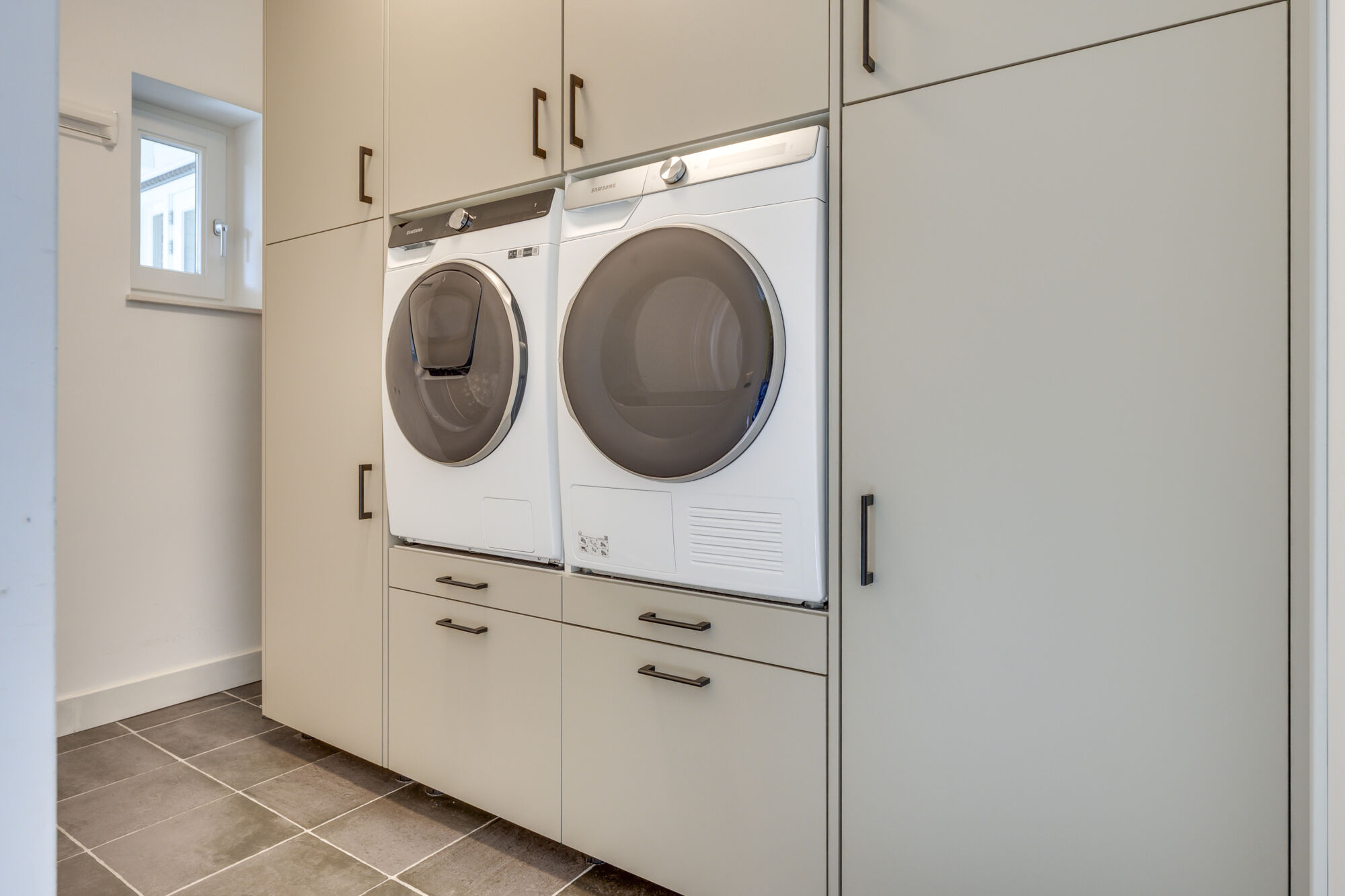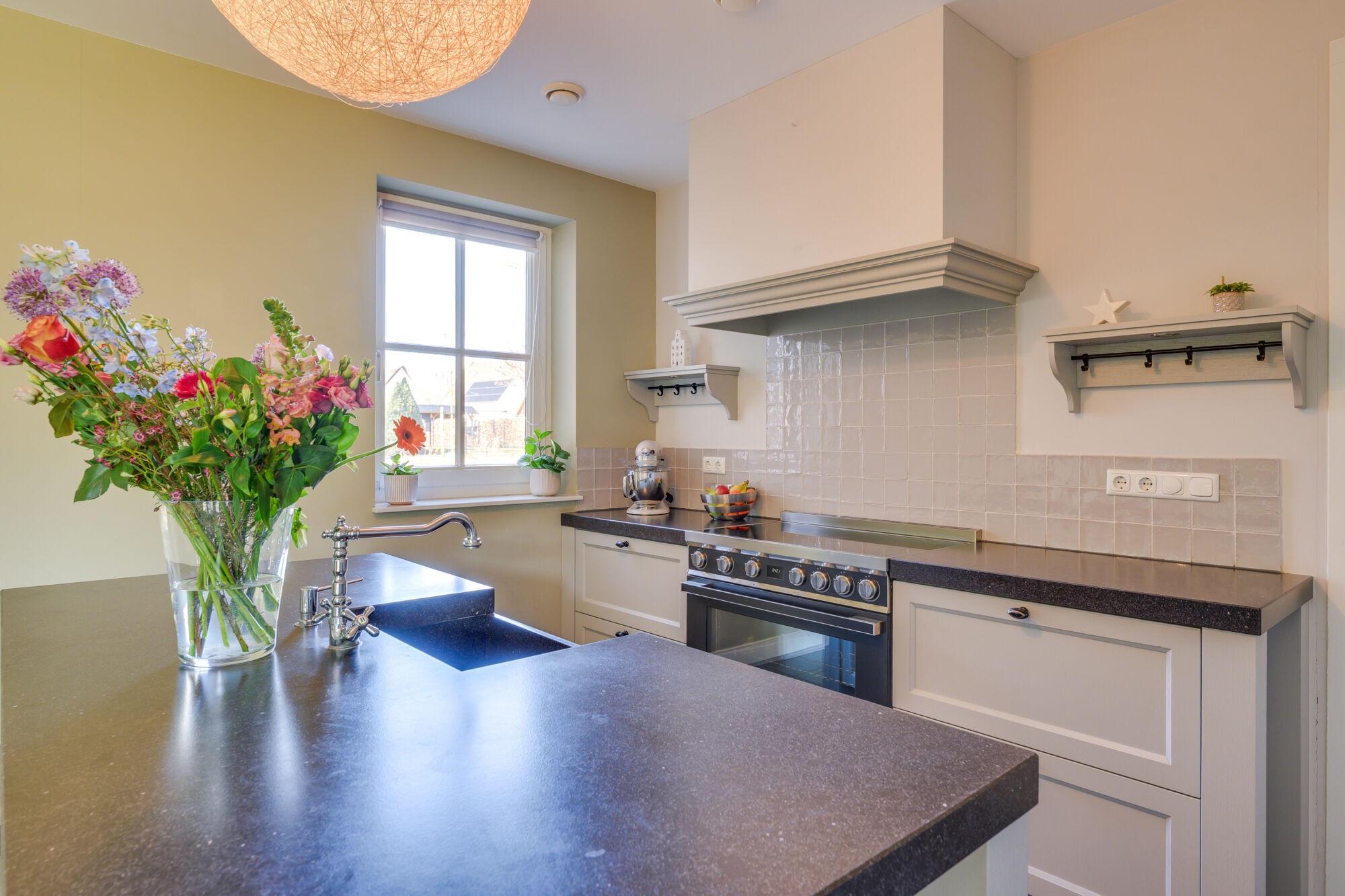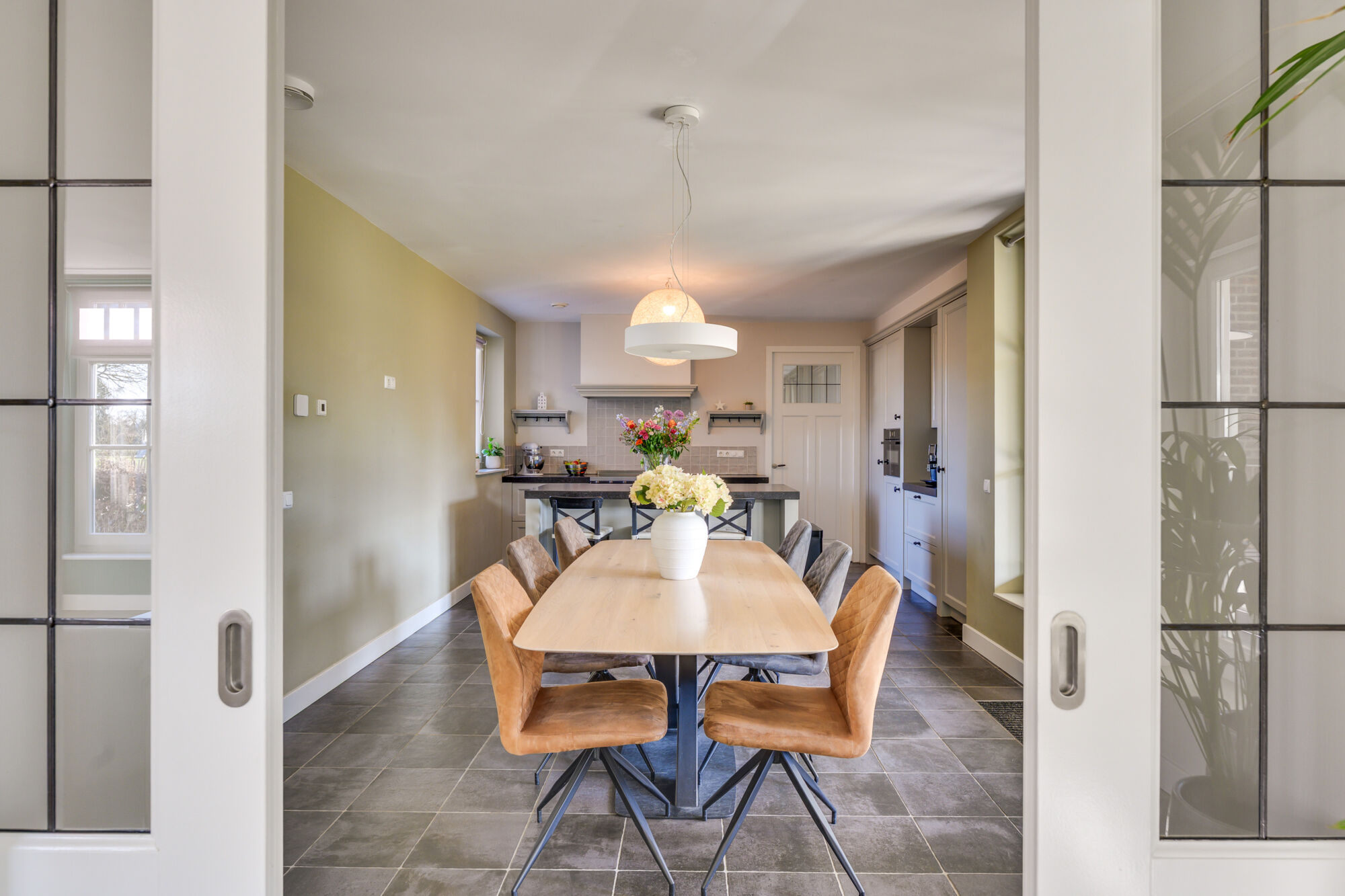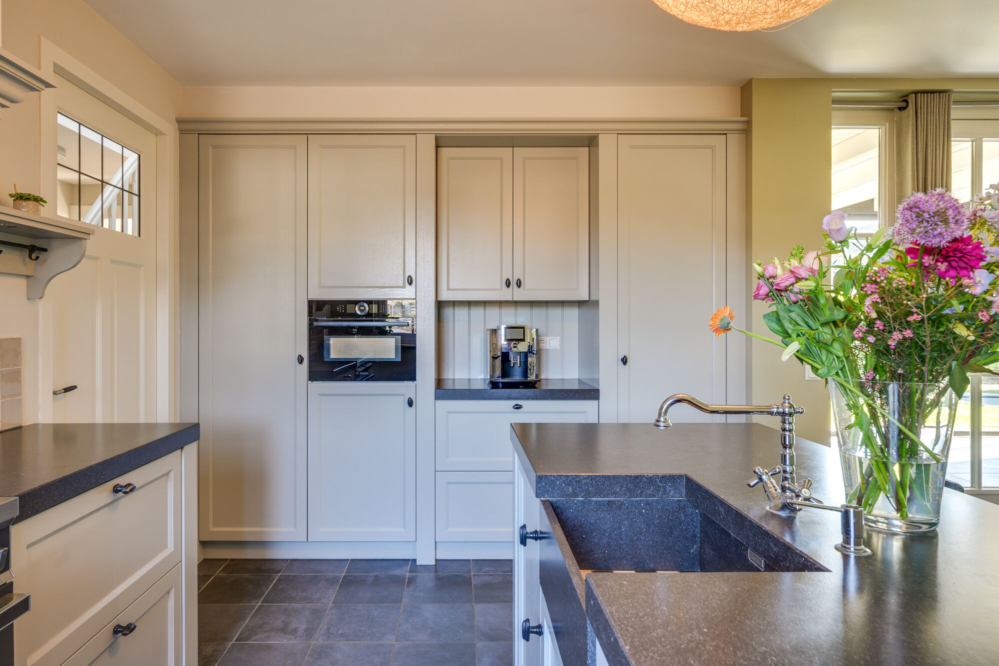 In de klassieke woonkeuken is voldoende ruimte om een grote eettafel neer te zetten. Met recht spreken we hier over het hart van de woning. Hier zit u gezellig met vrienden en familie te borrelen en te eten. De keuken is voorzien van een vaatwasser, koelkast, afzuigkap, inductie kookplaat, grote oven, combi-oven, combi-magnetron en een close in boiler.