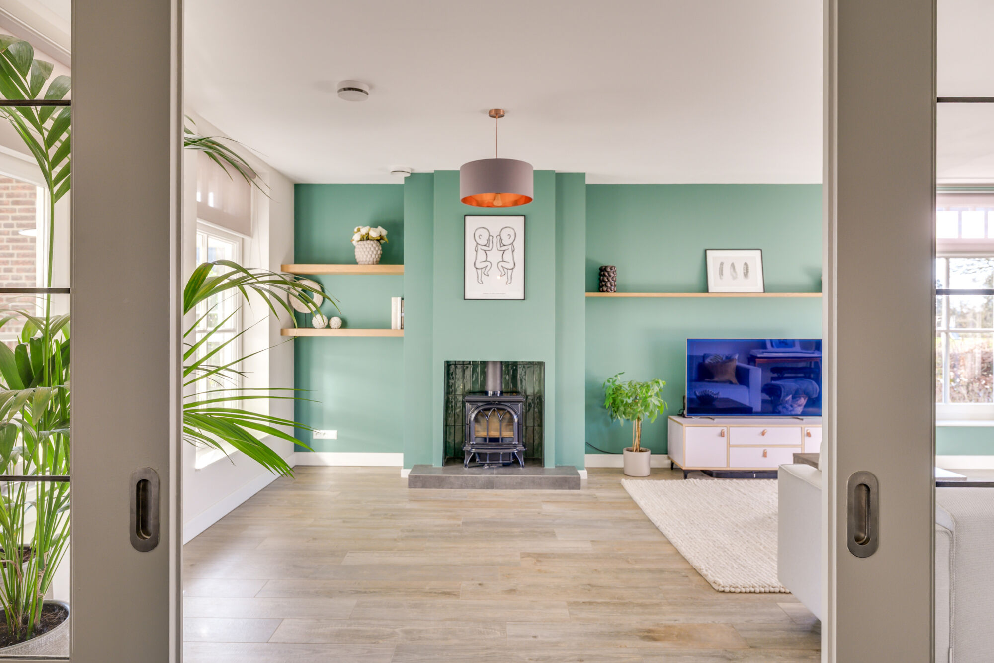 In de woonkamer ligt een tegelvloer met een fraai houtmotief, wat zorgt voor een warme en sfeervolle uitstraling. De houtkachel vormt hier een echte eyecatcher en geeft de ruimte direct extra charme en gezelligheid.