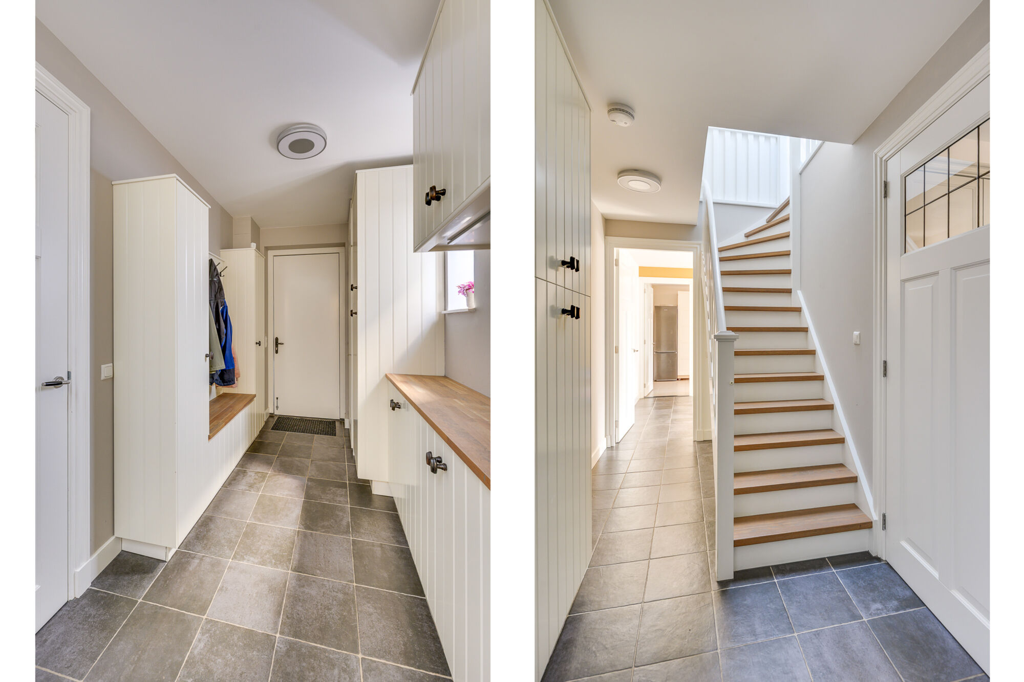 De tweede hal is bereikbaar via de inrit aan de voorzijde van de woning. Hier bevindt zich een zijdeur die zorgt voor een praktische extra ingang. Deze hal is momenteel ingericht als bijkeuken/garderobe. Dankzij de aanwezige kasten is er volop praktische bergruimte voor jassen en andere spullen. Ook bevindt zich hier de meterkast.
