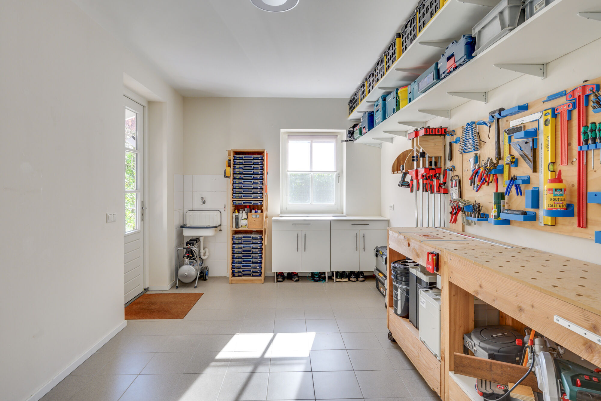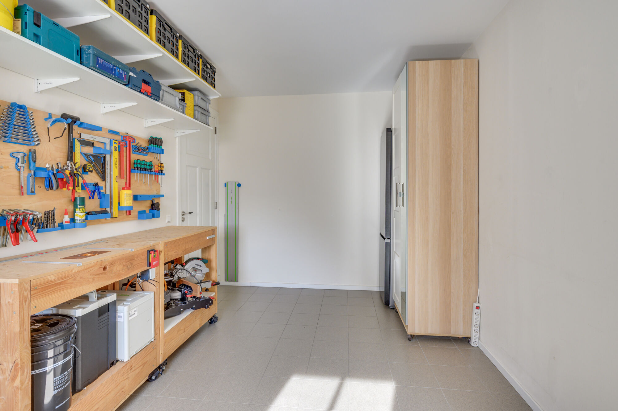 De woning beschikt over een grote inpandige berging die kan dienen als klusruimte. Momenteel wordt deze berging ook gebruikt voor de opslag van klusmateriaal. De ruimte heeft veel lichtinval en is voorzien van een uitstortgootsteen.